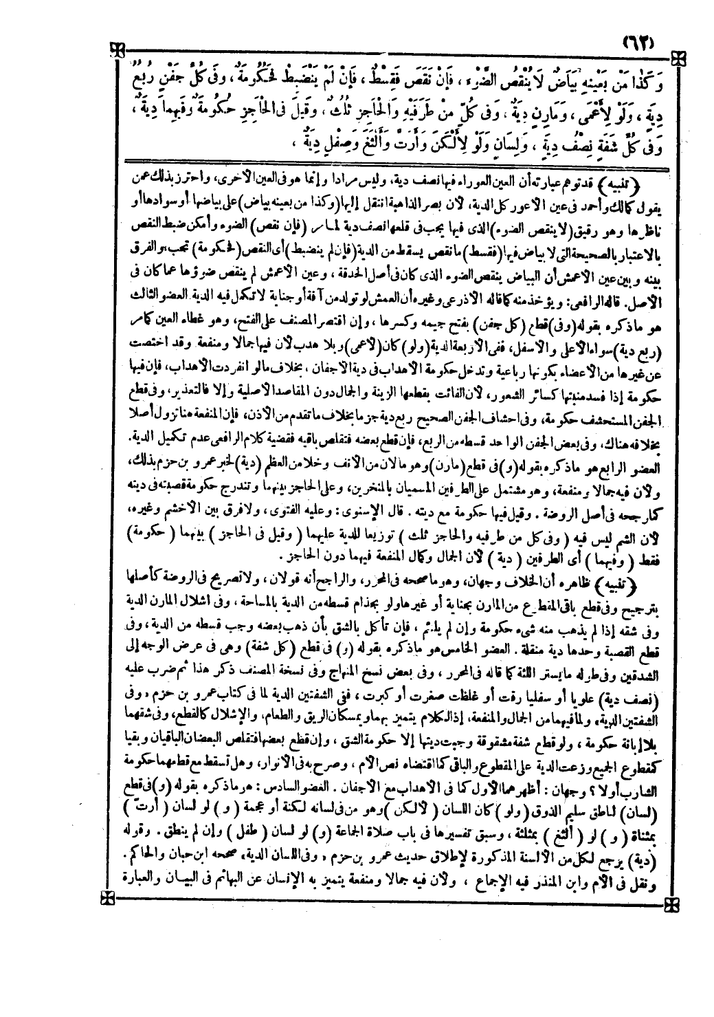العضو الخامس هو ما ذكره بقوله ( و ) في قطع ( كل شفة ) وهي في عرض الوجه إلى الشدقين وفي طوله ما يستر اللثة كما قاله في المحرر وفي بعض نسخ المنهاج وفي نسخة المصنف ذكر هذا ثم ضرب عليه ( نصف دية ) علويا أو سفليا رقت أو غلظت صغرت أو كبرت ففي الشفتين الدية لما في كتاب عمرو بن حزم وفي الشفتين الدية