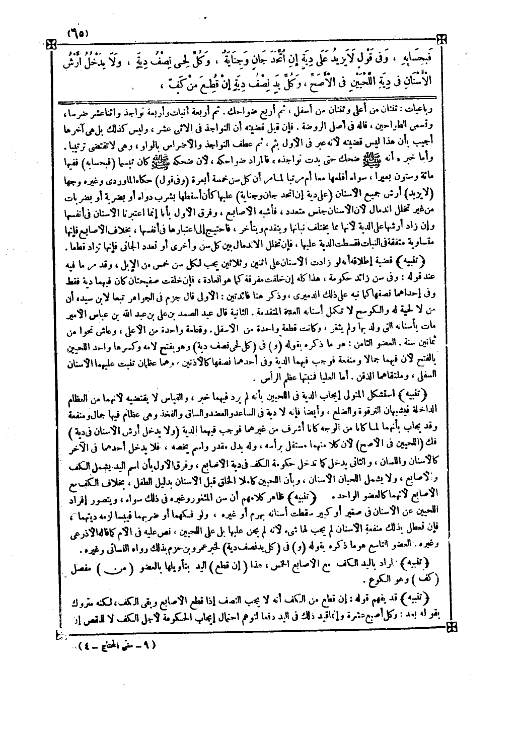 تنبيه المراد باليد الكف مع الأصابع الخمس هذا ( إن قطع ) اليد بتأويلها بالعضو ( من ) مفصل ( كف ) وهو الكوع