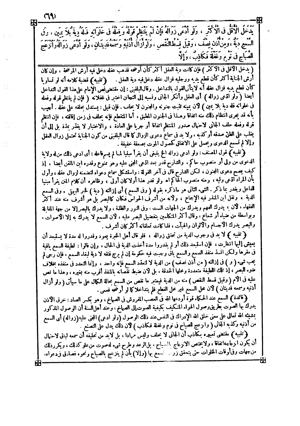 الشيء الثاني هو ما ذكره بقوله ( وفي السمع ) أي إزالته ( دية ) لخبر البيهقي وفي السمع الدية ونقل ابن المنذر فيه الإجماع ولأنه من أشرف الحواس فكان كالبصر بل هو أشرف منه عند أكثر الفقهاء لأن به يدرك الفهم ويدرك من الجهات الست وفي النور والظلمة ولا يدرك بالبصر إلا من جهة المقابلة وبواسطة من ضياء أو شعاع وقال أكثر المتكلمين بتفضيل البصر عليه لأن السمع لا يدرك به إلا الأصوات والبصر يدرك الأجسام والألوان والهيئات فلما كانت تعلقاته أكثر كان أشرف