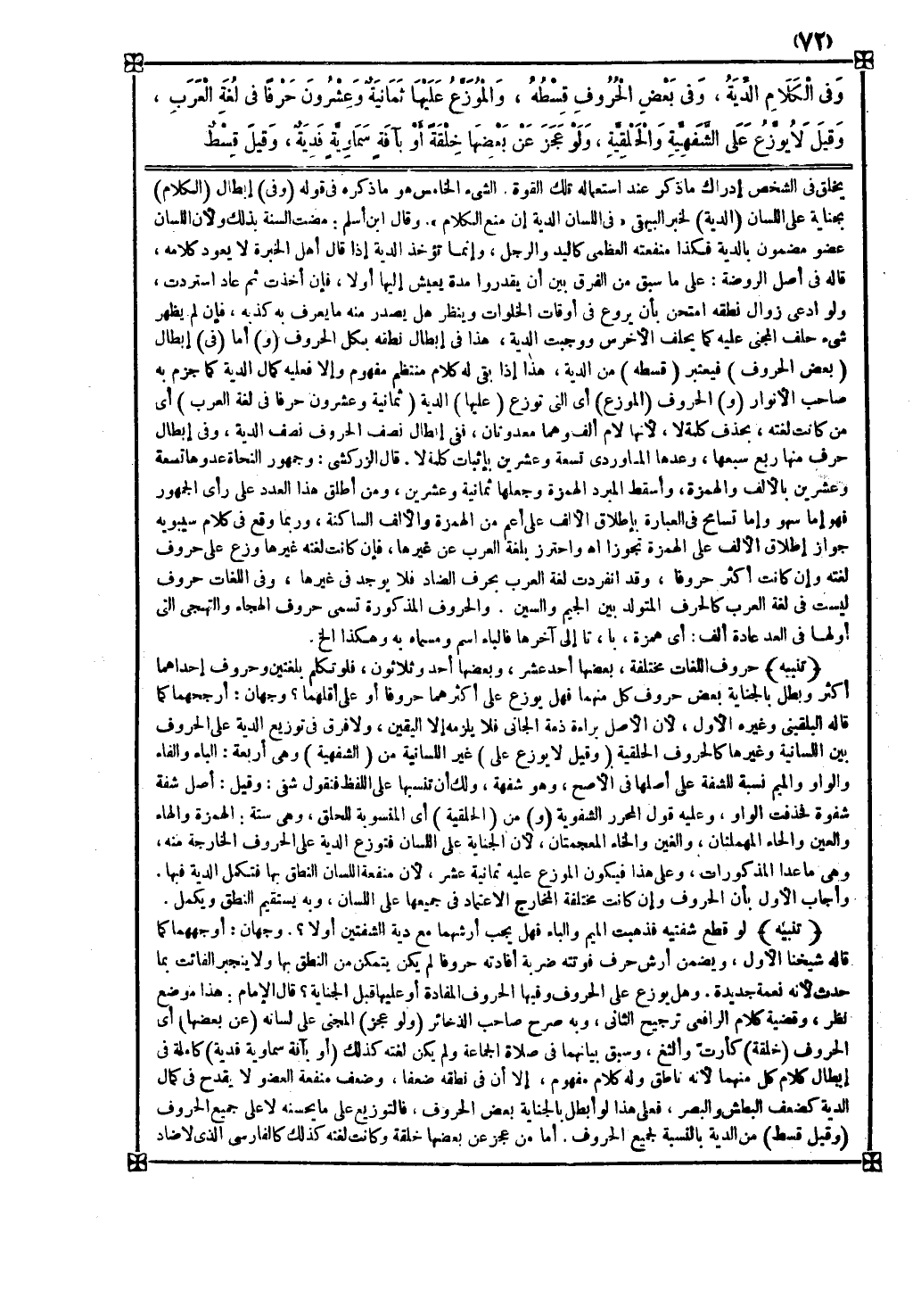 تنبيه حروف اللغات مختلفة بعضها أحد عشر وبعضها أحد وثلاثون فلو تكلم بلغتين وحروف إحداهما أكثر وبطل بالجناية بعض حروف كل منهما فهل يوزع على أكثرهما حروفا أو على أقلهما وجهان أرجحهما كما قاله البلقيني وغيره الأول لأن الأصل براءة ذمة الجاني فلا يلزمه إلا اليقين ولا فرق في توزيع الدية على الحروف بين اللسانية وغيرها كالحروف الحلقية ( وقيل لا يوزع على ) غير اللسانية من ( الشفهية ) وهي أربعة الباء والفاء والواو والميم نسبة للشفة على أصلها في الأصح وهو شفهة ولك أن تنسبها على اللفظ فنقول شفي