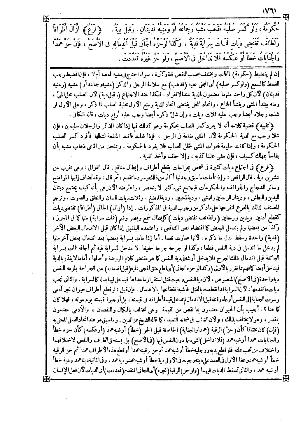 قال الرافعي وإذا تأملت ما سبق وجدتها أكثر من ذلك وسرد ما تقدم ثم قال وقد تضاف إليها المواضح وسائر الشجاج والجوائف والحكومات فيجتمع شيء كثير لا ينحصر واعترضه الأذرعي بأنه كيف يجتمع ديتان لليدين وللبطش وديتان للرجلين وللمشي ودية للحيين ودية للمضغ وثلاث ديات للسان والنطق والصوت وترجم المصنف لذلك بالفرع لتفرعها على ما ذكر من وجوب الدية في المذكورات