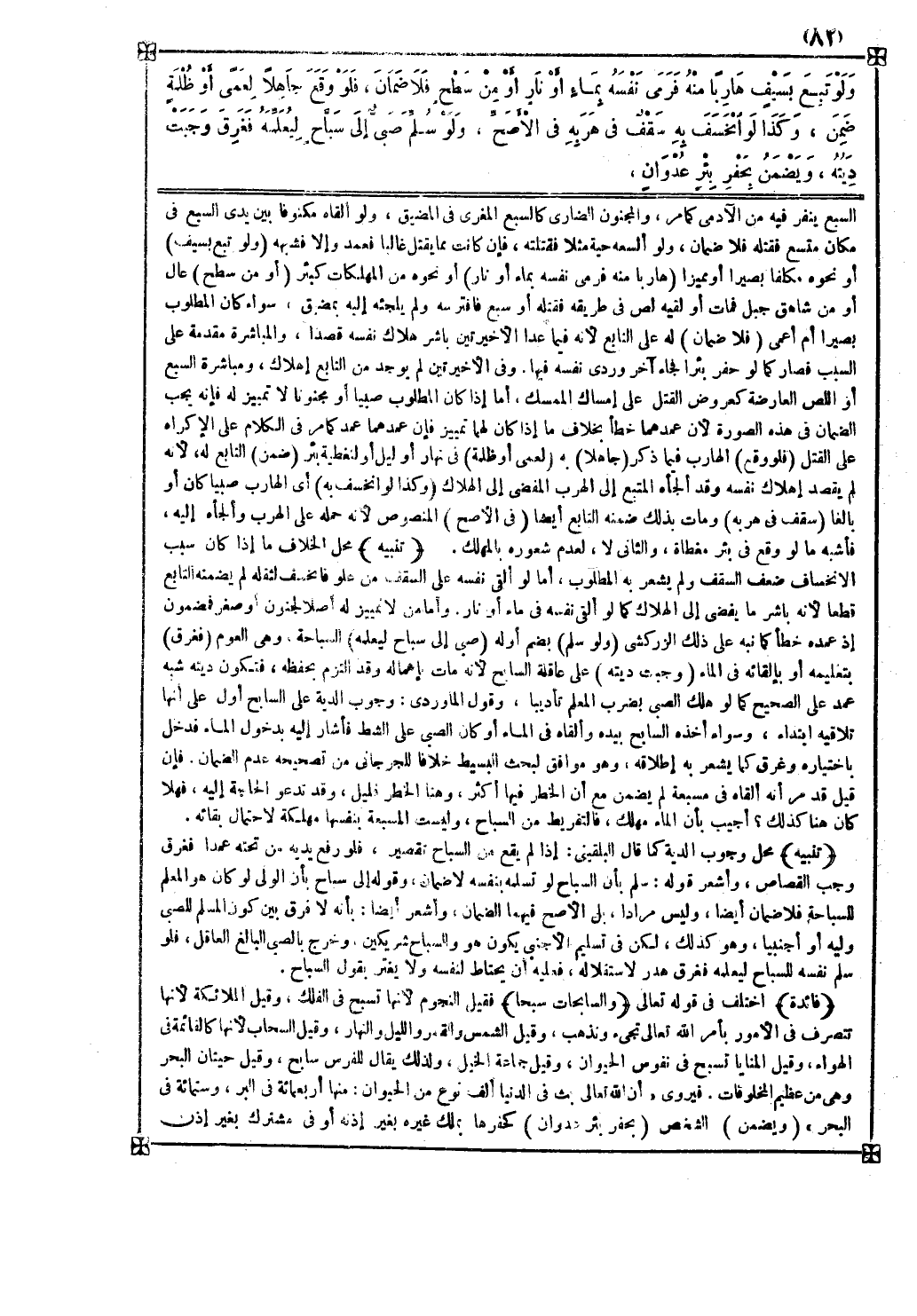 تنبيه محل وجوب الدية كما قال البلقيني إذا لم يقع من السباح تقصير فلو رفع يديه من تحته عمدا فغرق وجب القصاص