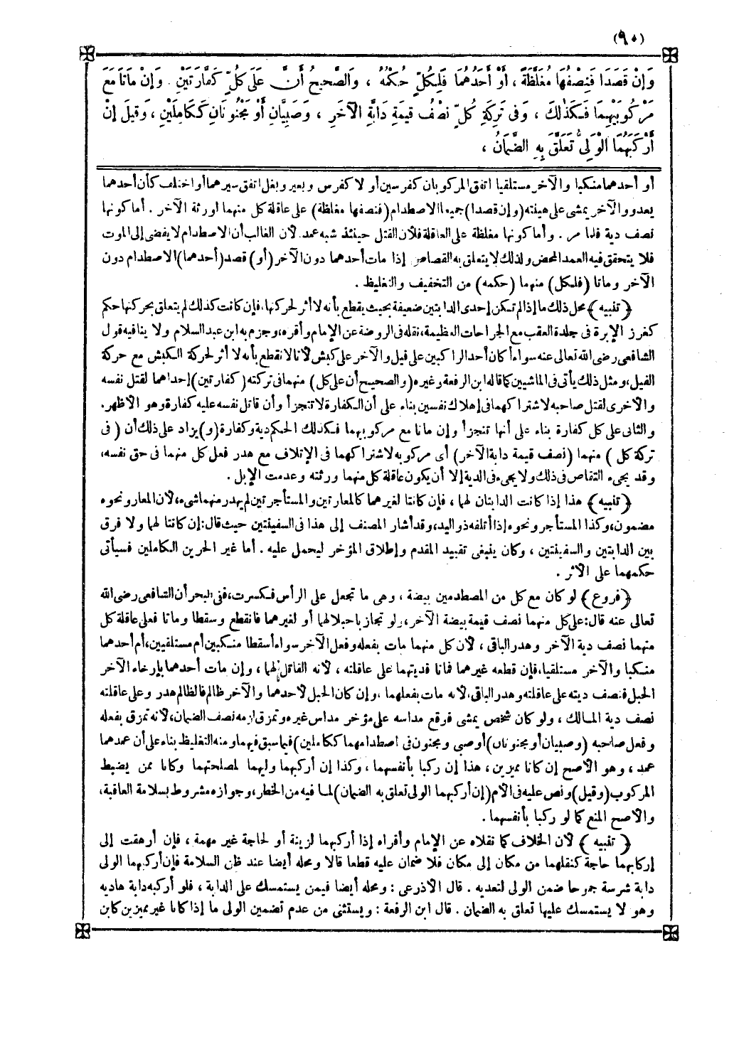 تنبيه محل ذلك ما إذا لم تكن إحدى الدابتين ضعيفة بحيث يقطع بأنه لا أثر لحركتها فإن كانت كذلك لم يتعلق بحركتها حكم كغرز الإبرة في جلدة العقب مع الجراحات العظيمة نقله في الروضة عن الإمام وأقره وجزم به ابن عبد السلام ولا ينافيه قول الشافعي رضي الله تعالى عنه سواء أكان أحد الراكبين على فيل والآخر على كبش لأنا لا نقطع بأنه لا أثر لحركة الكبش مع حركة الفيل ومثل ذلك يأتي في الماشيين كما قاله ابن الرفعة وغيره ( والصحيح أن على كل ) منهما في تركته ( كفارتين ) إحداهما لقتل نفسه والأخرى لقتل صاحبه لاشتراكهما في إهلاك نفسين بناء على أن الكفارة لا تتجزأ وأن قاتل نفسه عليه كفارة وهو الأظهر