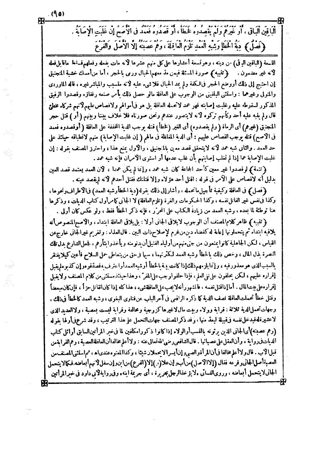 فصل في العاقلة وكيفية تأجيل ما تحمله وأشار إلى ذلك بقوله ( دية الخطأ وشبه العمد ) في الأطراف ونحوها وكذا في نفس غير القاتل نفسه وكذا الحكومات والغرة ( تلزم العاقلة ) لا الجاني كما مر أول كتاب الديات وذكرها هنا توطئة لما بعده وشبه العمد من زيادة الكتاب على المحرر فإنه ذكر الخطأ فقط ولو عكس كان أولى