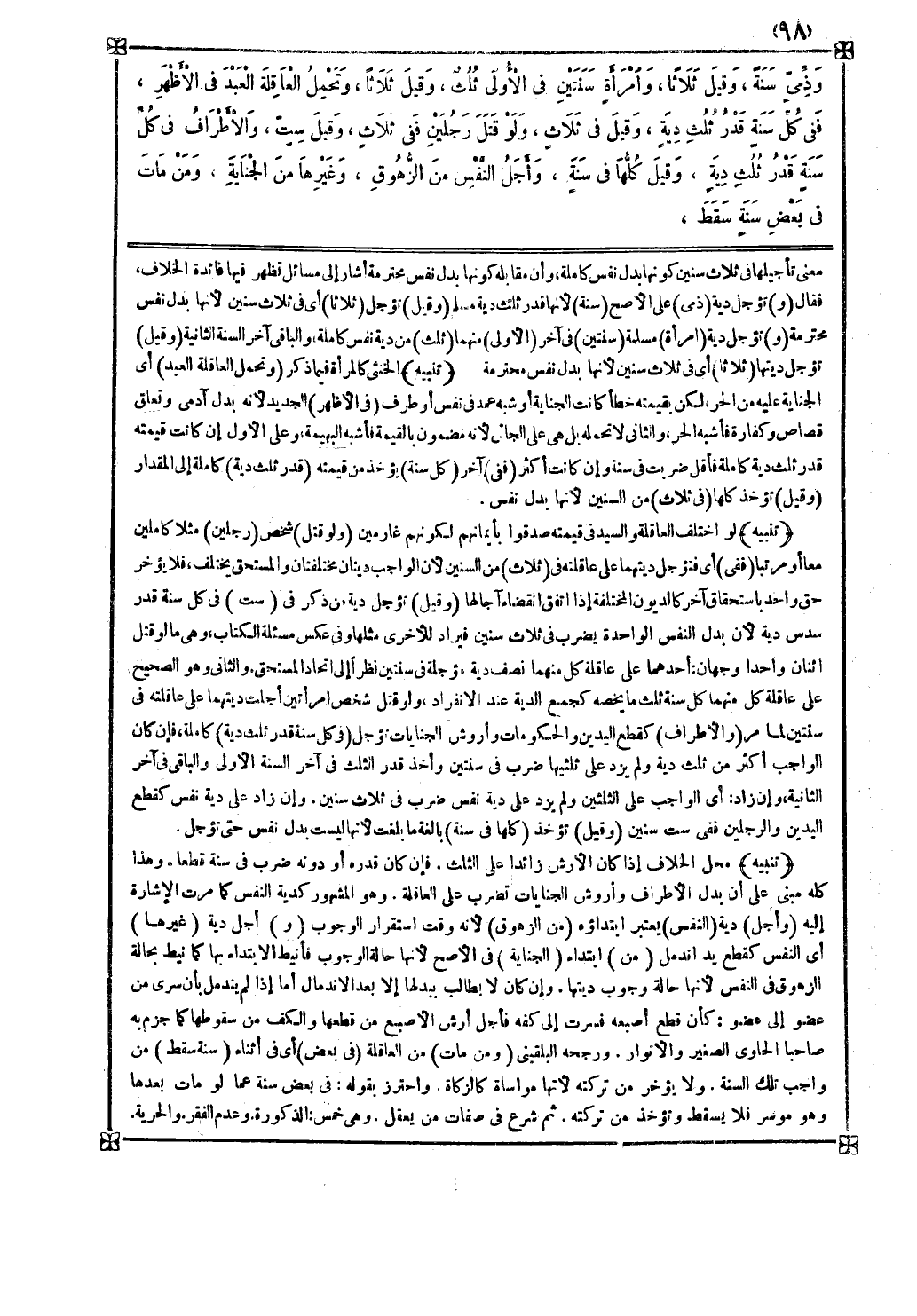 والثاني وهو الصحيح على عاقلة كل منهما كل سنة ثلث ما يخصه كجمع الدية عند الانفراد ولو قتل شخص امرأتين أجلت ديتهما على عاقلته في سنتين لما مر ( والأطراف ) كقطع اليدين والحكومات وأرش الجنايات تؤجل ( في كل سنة قدر ثلث دية ) كاملة فإن كان الواجب أكثر من ثلث دية ولم يزد على ثلثيها ضرب في سنتين وأخذ قدر الثلث في آخر السنة الأولى والباقي في آخر الثانية وإن زاد أي الواجب على الثلثين ولم يزد على دية نفس ضرب في ثلاث سنين
