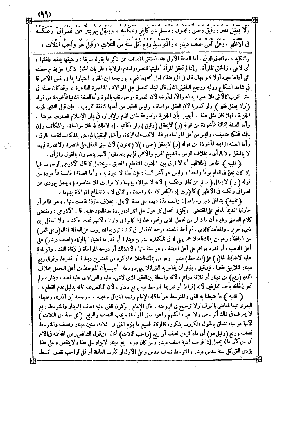 تنبيه ما ضبطنا به الغني والمتوسط هو ما قاله الإمام وتبعه الغزالي وغيره ورجحه ابن المقري وضبطه البغوي تبعا للقاضي بالعرف ولا ترجيح في الروضة
