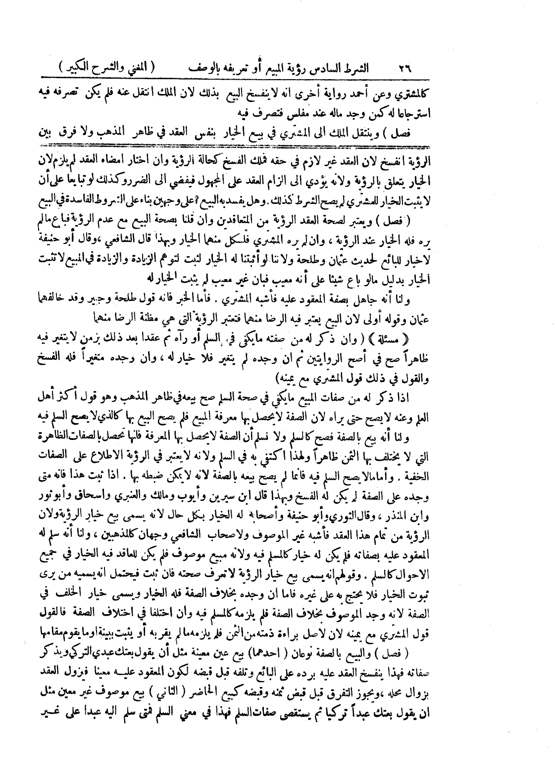 وهل يفسد به البيع؟ على وجهين بناء على الشروط الفاسدة في البيع (فصل) ويعتبر لصحة العقد الرؤية من المتعاقدين وإن قلنا بصحة البيع مع عدم الرؤية فباع ما لم يره فله الخيار عند الرؤية، وإن لم يره المشتري فلكل منهما الخيار وبهذا قال الشافعي، وقال أبو حنيفة لاخيار للبائع لحديث عثمان وطلحة ولأننا لو أثبتنا له الخيار لثبت لتوهم الزيادة والزيادة في المبيع لا تثبت الخيار بدليل مالو باع شيئاً على أنه معيب فبان غير معيب لم يثبت الخيار له ولنا أنه جاهل بصفة المعقود عليه فأشبه المشتري.