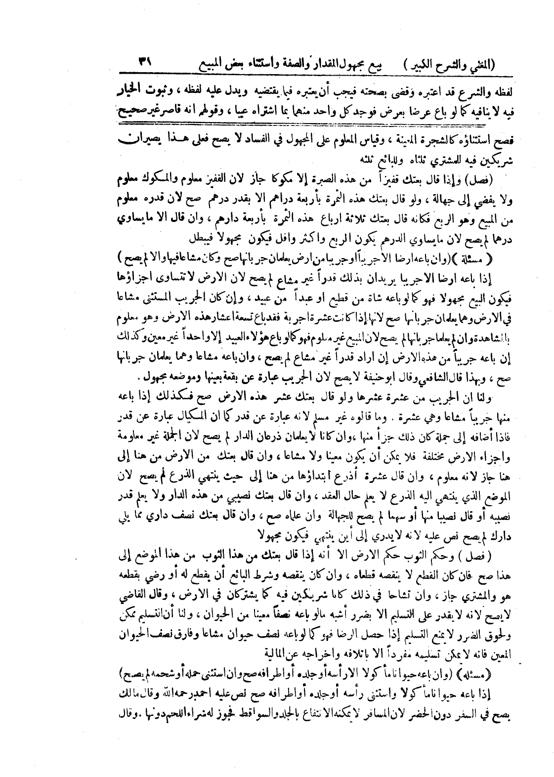(فصل) وإذا قال بعتك قفيزاً من هذه الصبرة إلا مكوكاً جاز لأن القفيز معلوم والمكوك معلوم ولا يفضي إلى جهالة، ولو قال بعتك هذه الثمرة بأربعة دراهم إلا بقدر درهم صح لأن قدره معلوم من المبيع وهو الربع فكأنه قال بعتك ثلاثة أرباع هذه الثمرة بأربعة دراهم، وإن قال إلا ما يساوي درهماً لم يصح لأن ما يساوي الدرهم يكون الربع وأكثر وأقل فيكون مجهولاً فيبطل {مسألة} (وإن باعه أرضاً إلا جريباً أو جريباً من أرض يعلمان جربانها صح وكان مشاعاً فيها وإلا لم يصح) إذا باعه أرضاً إلا جريباً يريدان بذلك قدراً غير مشاع لم يصح لأن الأرض لا تساوي اجزاؤها فيكون البيع مجهولاً فهو كما لو باعه شاة من قطيع أو عبداً من عبيد، وإن كان الجريب المستثنى مشاعاً في الأرض وهما يعلمان جربانها صح لأنها إذا كانت عشرة أجربه فقد باع تسعة أعشار هذه الأرض وهو معلوم بالمشاهدة وإن لم يعلما جربانها لم يصح لأن المبيع غير معلوم فهو كما لو باع هؤلاء العبيد إلا واحداً غير معين وكذلك إن باعه جريباً من هذه الأرض إن أراد قدراً غير مشاع لم يصح، وإن باعه مشاعاً وهما يعلمان جربانها صح، وبهذا قال الشافعي وقال أبو حنيفة لا يصح لأن الجريب عبارة عن بقعة بعينها وموضعه مجهول.