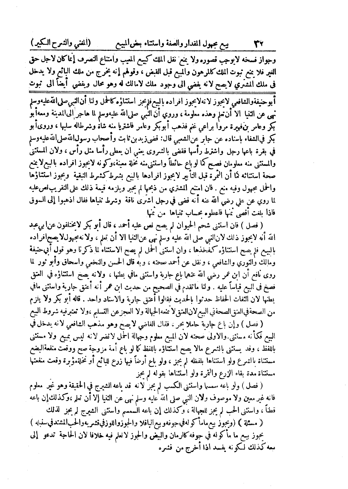 والاولى صحته لا المبيع معلوم وجهالة الحمل لا تضر لأنه ليس بمبيع ولا مستثنى باللفظ، وقد يستثنى بالشرع ما لا يصح استثناؤه باللفظ كما لو باع أمة مزوجة صح ووقعت منفعة البضع مستثناة بالشرع ولو استثناها بلفظه لم يجز، ولو باع أرضاً فيها زرع للبائع أو نخله مؤبرة وقعت منفعتها مستثناة مدة بقاء الزرع والثمرة ولو استثناها بقوله لم يجز (فصل) ولو باعه سمسماً واستثنى الكسب لم يجز لأنه قد باعه الشريج في الحقيقة وهو غير معلوم فإنه غير معين ولا موصوف ولأن النبي صلى الله عليه وسلم نهى عن الثنيا إلا أن تعلم، وكذلك إن باعه قطناً، واستثنى الحب لم يجز للجهالة، وكذلك إن باعه السمسم واستثنى الشيرج لم يجز لذلك {مسألة} (ويجوز بيع ما مأكوله في جوفه وبيع الباقلا والجوز واللوز في قشريه والحب المشتد في سنبله) يجوز بيع ما مأكوله في جوفه كالرمان والبيض والجوز لا نعلم فيه خلافا لأن الحاجة تدعو إلى بيعه كذلك لكونه يفسد إذا أخرج من قشره