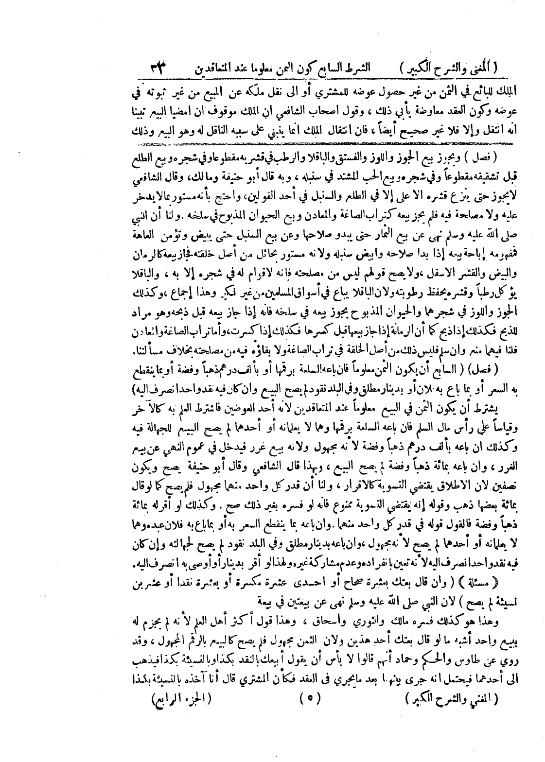 (فصل) (السابع أن يكون الثمن معلوماً فإن باعه السلعة برقمها أو بألف درهم ذهباً وفضة أو بما ينقطع به السعر أو بما باع به فلان أو بدينار مطلق وفي البلد نقود لم يصح البيع وإن كان فيه نقد واحد انصرف إليه) يشترط أن يكون الثمن في البيع معلوماً عند المتعاقدين لأنه أحد العوضين فاشترط العلم به كالآخر وقياساً على رأس مال السلم فإن باعه السلعة برقمها وهما لا يعلمانه أو أحدهما لم يصح البيع للجهالة فيه وكذلك إن باعه بألف درهم ذهباً وفضه لأنه مجهول ولأنه بيع غرر فيدخل في عموم النهي عن بيع الغرر، وإن باعه بمائة ذهباً وفضة لم يصح البيع، وبهذا قال الشافعي وقال أبو حنيفة يصح ويكون نصفين لأن الإطلاق يقتضي التسوية كالإقرار، ولنا أن قدر كل واحد منهما مجهول فلم يصح كما لو قال بمائة بعضها ذهب وقوله إنه يقتضي التسوية ممنوع فإنه لو فسره بغير ذلك صح.