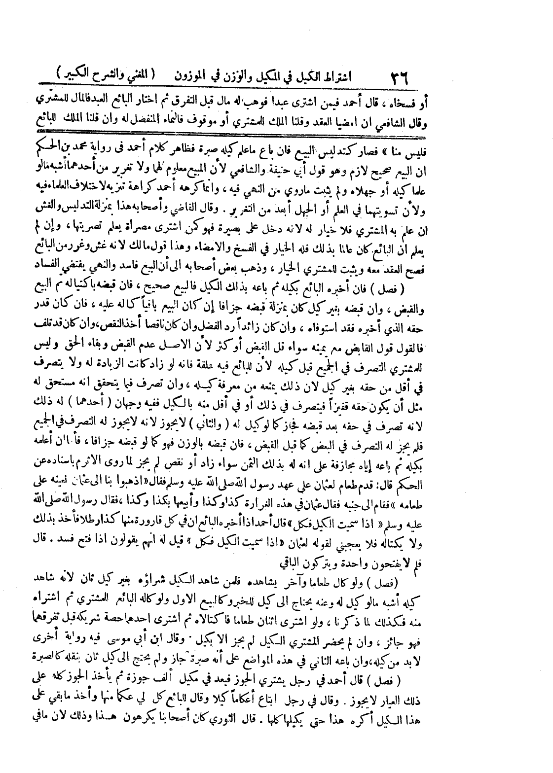 إن علم به المشتري فلا خيار له لأنه دخل على بصيرة فهو كمن اشترى مصراة يعلم تصريتها، وإن لم يعلم أن البائع كان عالماً بذلك فله الخيار في الفسخ والإمضاء وهذا قول مالك لأنه غش وغرر من البائع فصح العقد معه ويثبت للمشتري الخيار، وذهب بعض أصحابه إلى أن البيع فاسد والنهي يقتضي الفساد (فصل) فإن أخبره البائع بكيله ثم باعه بذلك الكيل فالبيع صحيح، فإن قبضه باكتياله تم البيع والقبض، وإن قبضه بغير كيل كان بمنزلة قبضه جزافاً إن كان البيع باقياً كاله عليه، فإن كان قدر حقه الذي أخبره فقد استوفاه، وان كان زائداً رد الفضل وإن كان ناقصاً أخذ النقص، وإن كان قد تلف فالقول قول القابض مع يمينه سواء قل القبض أو كثر لأن الأصل عدم القبض وبقاء الحق وليس للمشتري التصرف في الجميع قبل كيله لأن للبائع فيه علقة فإنه لو زاد كانت الزيادة له ولا يتصرف في أقل من حقه بغير كيل لأن ذلك يمنعه من معرفة كيله، وان تصرف فيما يتحقق أنه مستحق له مثل أن يكون حقه قفيزاً فيتصرف في ذلك أو في أقل منه بالكيل ففيه وجهان (أحدهما) له ذلك لأنه تصرف في حقه بعد قبضه فجاز كما لوكيل له (والثاني) لا يجوز لأنه لا يجوز له التصرف في الجميع فلم يجز له التصرف في البعض كما قبل القبض، فإن قبضه بالوزن فهو كما لو قبضه جزافاً، فأما إن أعلمه بكيلة ثم باعه إياه مجازفة على أنه له بذلك الثمن سواء زاد أو نقص لم يجز لما روى الأثرم باسناده عن الحكم قال: قدم طعام لعثمان على عهد رسول الله صلى الله عليه وسلم فقال " إذهبوا بنا إلى عثمان نعينه على طعامه " فقام إلى جنبه فقال عثمان في هذه الغرارة كذا وكذا وأبيعها بكذا وكذا، فقال رسول الله صلى الله عليه وسلم " إذا سميت الكيل فكل " قال أحمد إذا أخبره البائع أن في كل قارورة منها كذا رطلاً فأخذ بذلك ولا يكتاله فلا يعجبني لقوله فعثمان " إذا سميت الكيل فكل " قيل له إنهم يقولون إذا فتح فسد.