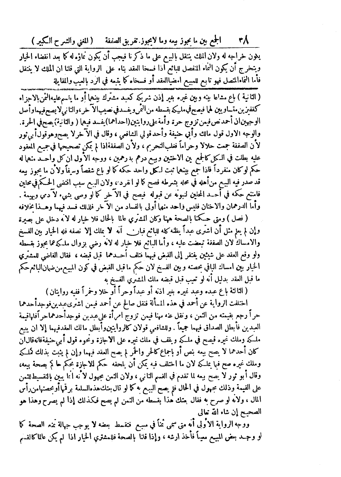 (الثانية) باع مشاعاً بينه وبين غيره بغير إذن شريكه كعبد مشترك بينهما أو ما يقسم عليه الثمن بالأجزاء كقفيزين متساويين لهما فيصح في ملكه بقسطه من الثمن ويفسد في نصيب الآخر، والثاني لا يصح فيهما وأصل الوجهين أن أحمد نص فيمن تزوج حرة وأمة على روايتين (إحداهما) يفسد فيهما (والثانية) يصح في الحرة.