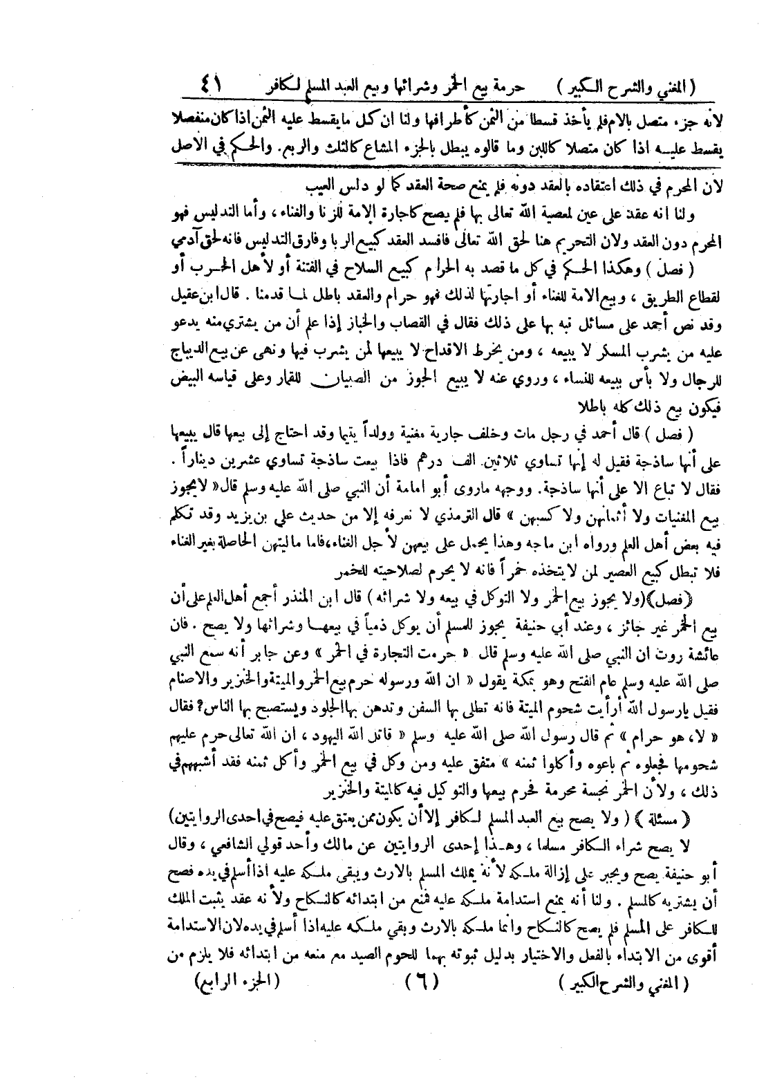 فإن عائشة روت أن النبي صلى الله عليه وسلم قال " حرمت التجارة في الخمر " وعن جابر أنه سمع النبي صلى الله عليه وسلم عام الفتح وهو بمكة يقول " إن الله ورسوله حرم بيع الخمر والميتة والخنزير والأصنام فقيل يا رسول الله أرأيت شحوم الميتة فإنه تطلى بها السفن وتدهن بها الجلود ويستصبح بها الناس؟ فقال " لا، هو حرام " ثم قال رسول الله صلى الله عليه وسلم " قاتل الله اليهود، أن الله تعالى حرم عليهم شحومها فجعلوه ثم باعوه وأكلوا ثمنه " متفق عليه ومن وكل في بيع الخمر وأكل ثمنه فقد أشبههم في ذلك، ولأن الخمر نجسه محرمة فحرم بيعها والتوكيل فيه كالميتة والخنزير {مسألة} (ولا يصح بيع العبد المسلم لكافر إلا أن يكون ممن يعتق عليه فيصح في إحدى الروايتين) لا يصح شراء الكافر مسلماً، وهذا إحدى الروايتين عن مالك وأحد قولي الشافعي، وقال أبو حنيفة يصح ويجبر على إزالة ملكه لأنه يملك المسلم بالإرث ويبقى ملكه عليه إذا أسلم في يده فصح أن يشتريه كالمسلم.