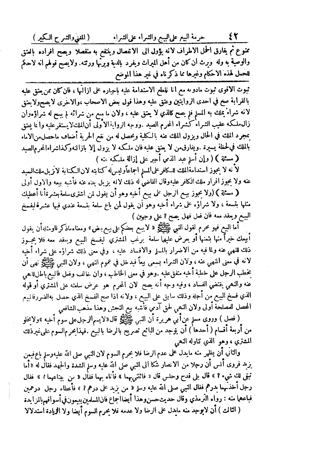 ويفارق من لا يعتق عليه فإن ملكه لا يزول إلا بإزالته وكذا شراء المحرم الصيد {مسألة} (وإن أسلم عبد الذمي أجبر على إزالة مكله عنه) لأنه لا يجوز استدامة الملك للكافر على المسلم إجماعاً وليس له كتابته لأن الكتابة لا تزيل ملك السيد عنه ولايجوز اقرار ملك الكافر عليه وقال القاضي له ذلك لأنه يزيل يده عنه فأشبه بيعه والأول أولى {مسألة} (ولايجوز بيع الرجل على بيع أخيه وهو أن يقول لمن اشترى سلعة بعشرة أنا أعطيك مثلها بتسعة، ولا شراؤه على شراء أخيه وهو أن يقول لمن باع سلعة بتسعة عندي فيها عشرة ليفسخ البيع ويعقد معه فإن فعل فهل يصح؟ على وجهين) أما البيع فهو محرم لقول النبي صلى الله عليه وسلم " لابيع بعضكم على بيع بعض " ومعناه ما ذكرنا ومثله أن يقول أبيعك خيراً منها بثمنها أو يعرض عليهما سلعة يرغب المشتري ليفسخ البيع ويعقد معه فلا يجوز ذلك للنهي عنه ولما فيه من الاضرار بالمسلم والإفساد عليه، وفي معنى ذلك شراؤه على شراء أخيه لأنه في معنى المنهي عنه، ولأن الشراء يسمى بيعاً فيدخل في عموم النهي، ولأن النبي صلى الله عليه وسلم نهى أن يخطب الرجل على خطبة أخيه متفق عليه.