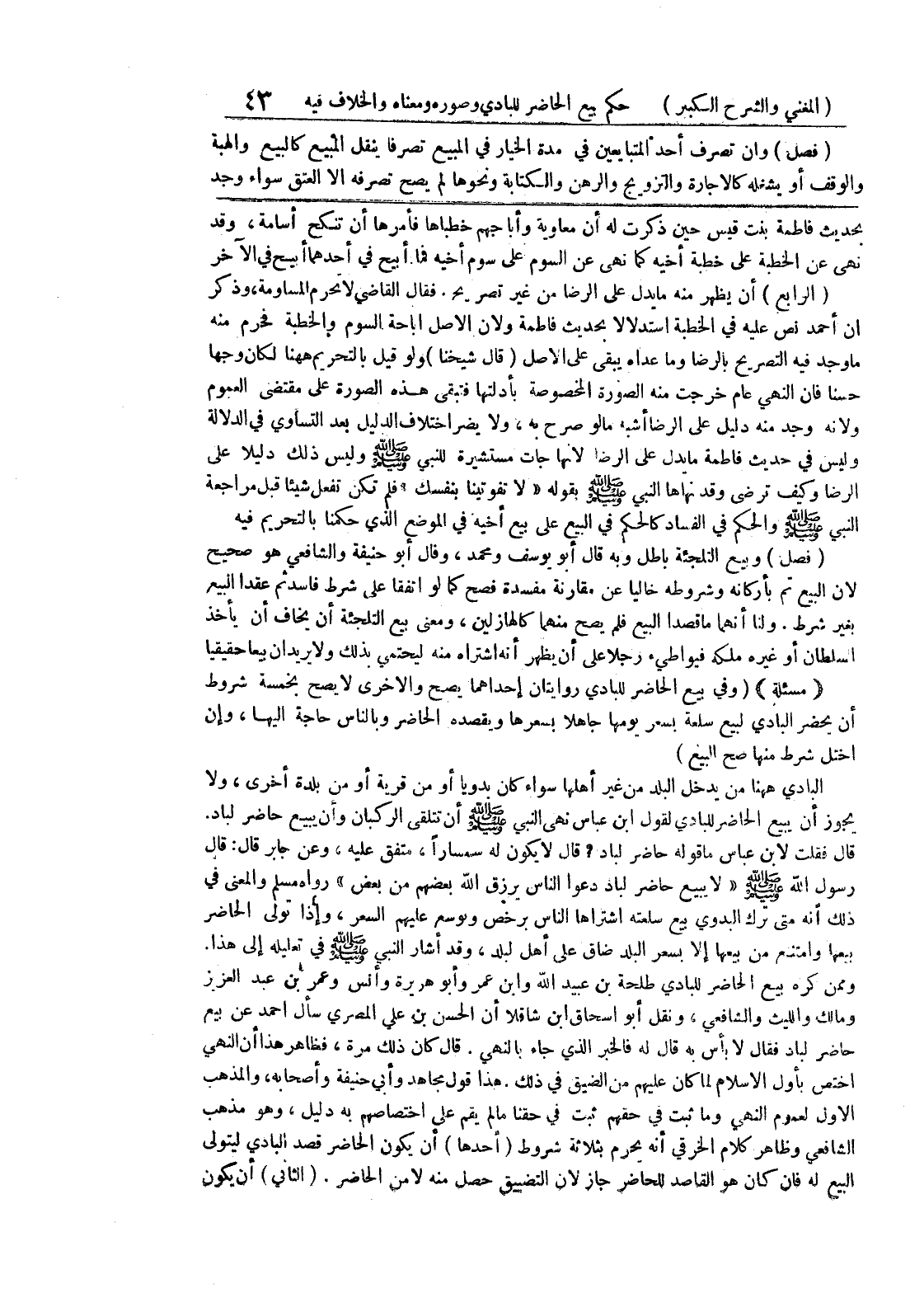 ولنا أنهما ما قصدا البيع فلم يصح منهما كالهازلين، ومعنى بيع التلجئة أن يخاف أن يأخذ السلطان أو غيره ملكه فيواطئ رجلا على أن يظهر أنه اشتراه منه ليحتمي بذلك ولا يريدان بيعاً حقيقيا {مسألة} (وفي بيع الحاضر للبادي روايتان إحداهما يصح والأخرى لا يصح بخمسة شروط أن يحضر البادي لبيع سلعة بسعر يومها جاهلاً بسعرها ويقصده الحاضر وبالناس حاجة إليها، وإن اختل شرط منها صح البيع) البادي ههنا من يدخل البلد من غير أهلها سواء كان بدوياً أو من قرية أو من بلدة أخرى، ولا يجوز أن يبيع الحاضر للبادي لقول ابن عباس نهى النبي صلى الله عليه وسلم أن تتلقى الركبان وأن يبيع حاضر لباد.