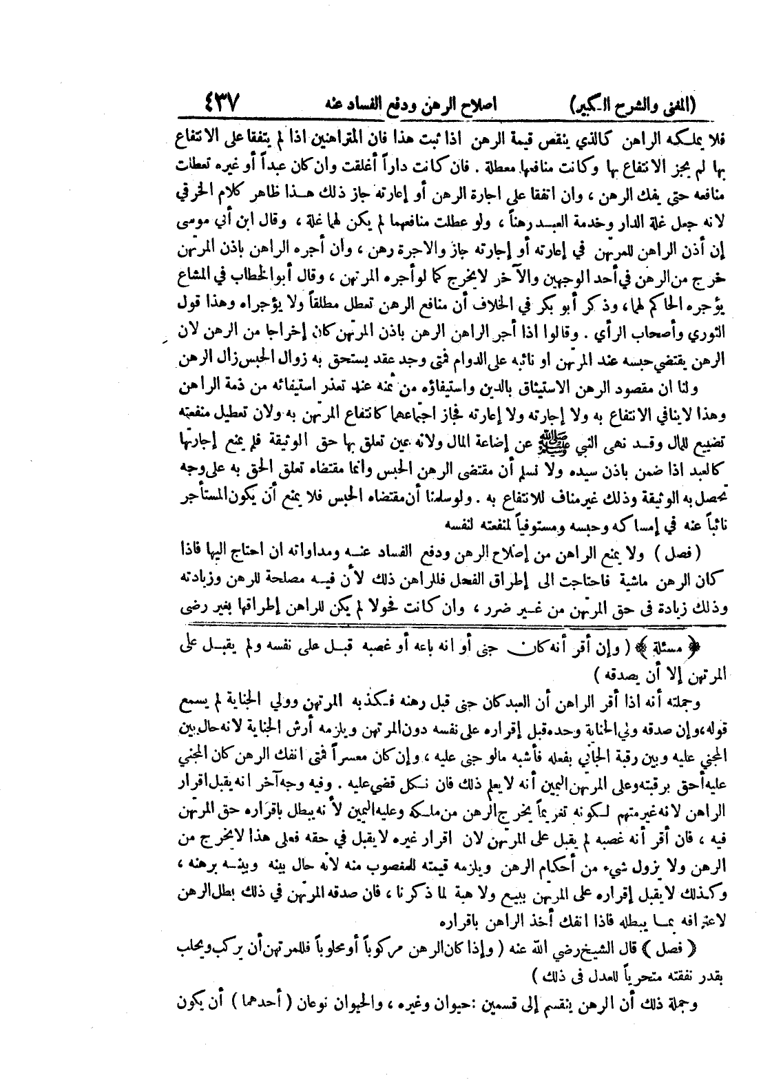 وفيه وجه آخر أنه يقبل إقرار الراهن لأنه غير متهم لكونه تغريماً يخرج الرهن من ملكه وعليه اليمين لأنه يبطل بإقراره حق المرتهن فيه، فإن أقر أنه غصبه لم يقبل على المرتهن لأن اقرار غيره لا يقبل في حقه فعلى هذا لا يخرج من الرهن ولا يزول شئ من أحكام الرهن ويلزمه قيمته للمغصوب منه لأنه حال بينه وبينه برهنه، وكذلك لا يقبل إقراره على المرتهن ببيع ولا هبة لما ذكرنا، فإن صدقة المرتهن في ذلك بطل الرهن لاعترافه بما يبطله فإذا انفك أخذ الراهن باقراره {مسألة} قال الشيخ رضي الله عنه (وإذا كان الرهن مركوباً أو محلوباً فللمرتهن أن يركب ويحلب بقدر نفقته متحرياً للعدل في ذلك) وجملة ذلك أن الرهن ينقسم إلى قسمين: حيوان وغيره، والحيوان نوعان (أحدهما) أن يكون