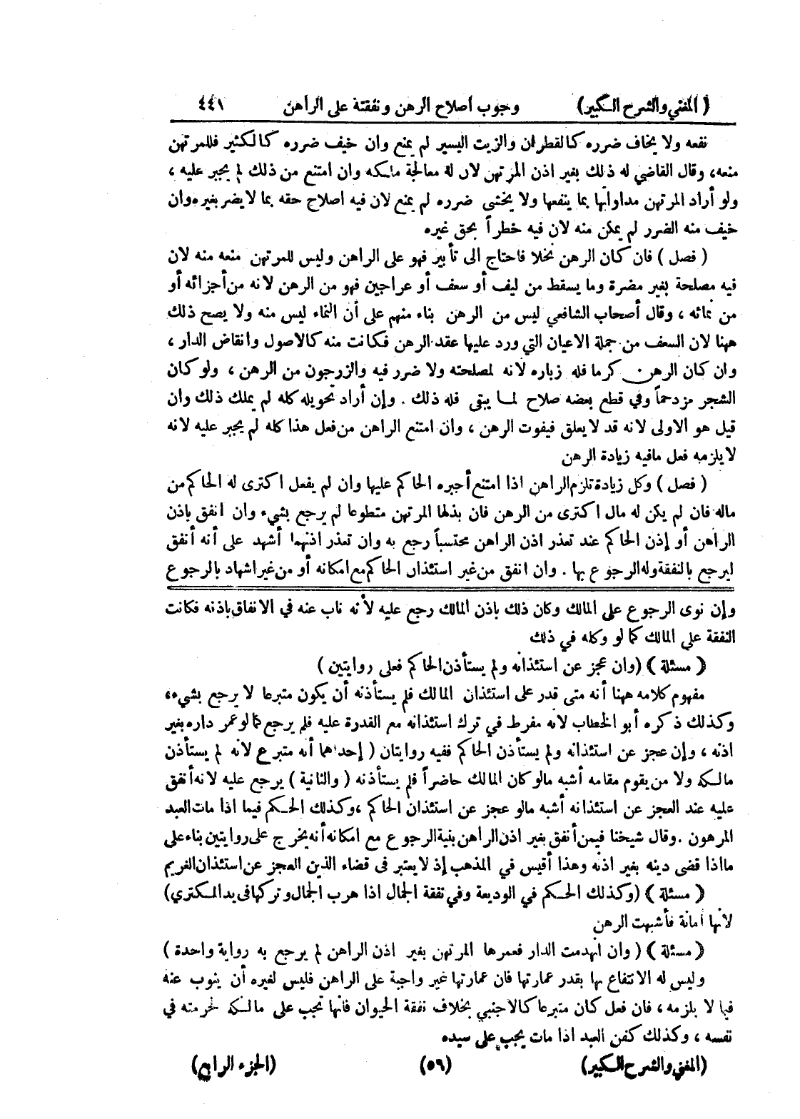 وقال شيخنا فيمن أنفق بغير إذن الراهن بنية الرجوع مع إمكانه أنه يخرج على روايتين بناء على ما إذا قضى دينه بغير إذنه وهذا أقيس في المذهب إذ لا يعتبر في قضاء الذين العجز عن استئذان الغريم {مسألة} (وكذلك الحكم في الوديعة وفي نفقة الجمال إذا هرب الجمال وتركها في يد المكتري) لأنها أمانة فأشبهت الرهن {مسألة} (وإن انهدمت الدار فعمرها المرتهن بغير إذن الراهن لم يرجع به رواية واحدة) وليس له الانتفاع بها بقدر عمارتها فان عمارتها غير واجبة على الراهن فليس لغيره أن ينوب عنه فيما لا يلزمه، فإن فعل كان متبرعاً كالأجنبي بخلاف نفقة الحيوان فإنها تجب على مالكه لحرمته في نفسه، وكذلك كفن العبد إذا مات يجب على سيده