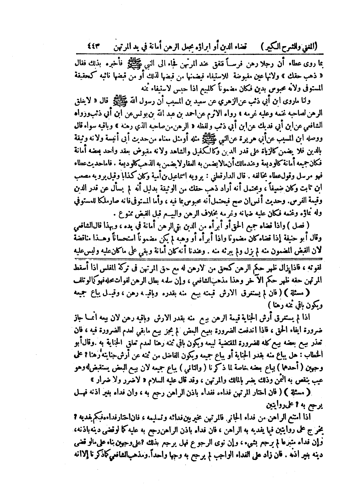 وقال أبو الخطاب: هل يباع منه بقدر الجناية أو يباع جميعه ويكون الفاضل من ثمنه عن أرش جنايته رهنا؟ على وجهين (أحدهما) يباع بعضه خاصة لما ذكرنا (والثاني) يباع جميعه لأن بيع البعض يستقبض له وهو عيب ينقص به الثمن وذلك يضر بالمالك والمرتهن، وقد قال عليه السلام " لاضرر ولا ضرار " {مسألة} (فإن اختار المرتهن فداءه ففداه بإذن الراهن رجع به، وإن فداه بغير إذنه فهل يرجع به؟ على روايتين إذا امتنع الراهن من فداء الجاني فالمرتهن مخير بين فدائه وتسليمه، فإن اختار فداءه فبكم يفديه؟