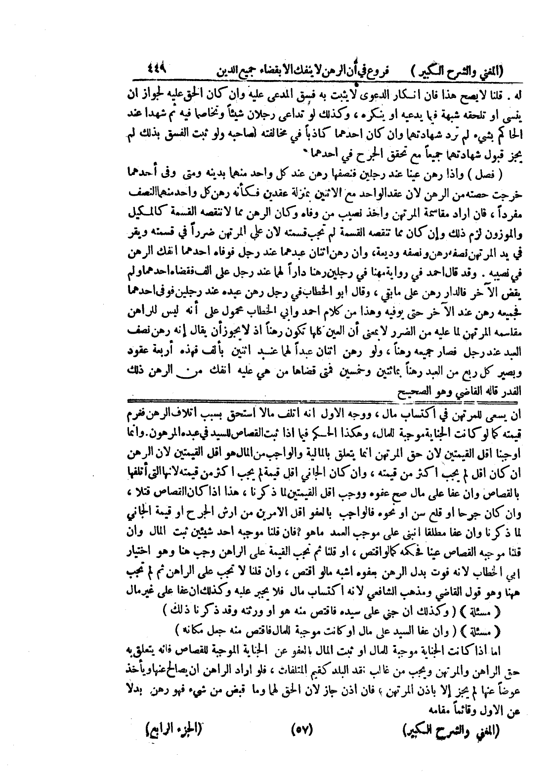وانما أو جبنا أقل القيمتين لأن حق المرتهن إنما يتعلق بالمالية والواجب من المال هو أقل القيمتين لأن الرهن إن كان أقل لم يجب أكثر من قيمته، وإن كان الجاني أقل قيمة لم يجب أكثر من قيمته لأنها التي أتلفها بالقصاص وإن عفا على مال صح عفوه ووجب أقل القيمتين لما ذكرنا، هذا إذا كان القصاص قتلاً، وإن كان جرحاً أو قلع سن أو نحوه فالواجب بالعفو أقل الأمرين من ارش الجرح أو قيمة الجاني لما ذكرنا وإن عفا مطلقاً انبنى على موجب العمد ما هو؟ فإن قلنا موجبه أحد شيئين ثبت المال وإن قلنا موجبه القصاص عينا فحكمه كما لو اقتص، أو قلنا ثم تجب القيمة على الراهن وجب هنا وهو اختيار أبي الخطاب لأنه فوت بدل الرهن بعفوه أشبه مالو اقتص، وإن قلنا لا تجب على الراهن ثم لم تجب ههنا وهو قول القاضي ومذهب الشافعي لأنه اكتساب مال فلا يجبر عليه وكذلك إن عفا على غير مال {مسألة} (وكذلك إن جنى على سيده فاقتص منه هو أو ورثته وقد ذكرنا ذلك) {مسألة} (وإن عفا السيد على مال أو كانت موجبة للمال فاقتص منه جعل مكانه) أما إذا كانت الجناية موجبة للمال أو ثبت المال بالعفو عن الجناية الموجبة للقصاص فإنه يتعلق به حق الراهن والمرتهن ويجب من غالب نقد البلد كقيم المتلفات، فلو أراد الراهن أن يصالح عنها ويأخذ عوضا عنها لم يجز إلا بإذن المرتهن، فإن أذن جاز لأن الحق لهما وما قبض من شئ فهو رهن بدلاً عن الأول وقائماً مقامه