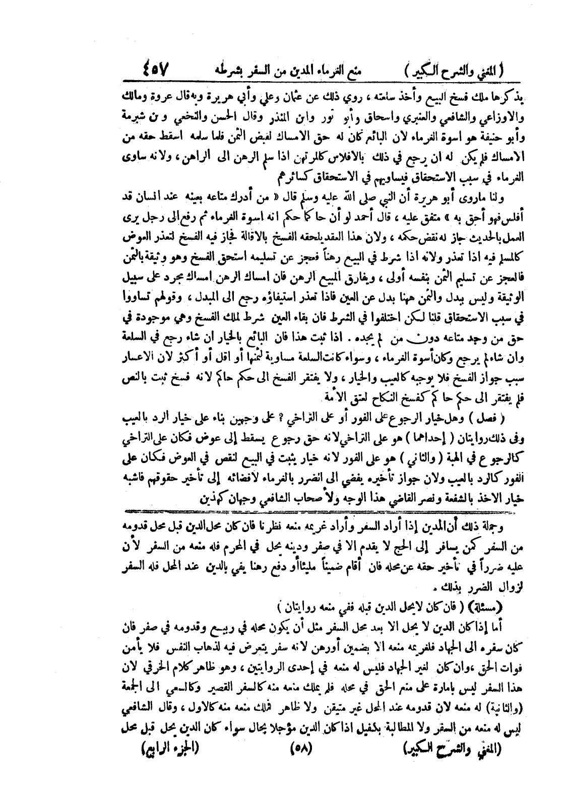 هذا السفر ليس با مارة على منع الحق في محله فلم يملك منعه منه كالسفر القصير وكالسعي إلى الجمعة (والثانية) له منعه لأن قدومه عند المحل غير متيقن ولا ظاهر فملك منعه منه كالأول، وقال الشافعي ليس له منعه من السفر ولا المطالبة بكفيل إذا كان الدين مؤجلاً بحال سواء كان الدين يحل قبل محل