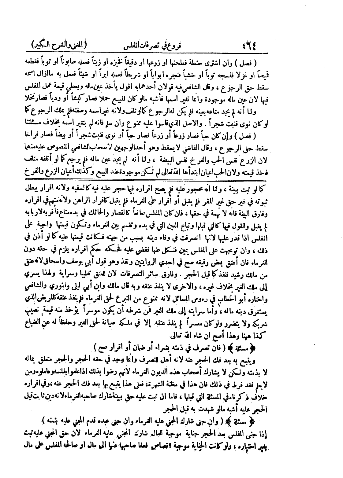 وفارق سائر التصرفات لأن للعتق تغليباً وسراية ولهذا يسري إلى ملك الغير بخلاف غيره، والأخرى لا ينفذ عتقه وبه قال مالك وابن أبي ليلى والثوري والشافعي واختاره أبو الخطاب في رءوس المسائل لأنه ممنوع من التبرع لحق الغرماء فلم ينفذ عتقه كالمريض الذي يستغرق دينه ماله، وأما سرايته إلى ملك الغير فمن شرطه أن يكون موسراً يؤخذ منه قيمة نصيب شريكه ولا يتضرر ولو كان معسراً لم ينفذ عتقه إلا في ملكه صيانة لحق الغير وحفظاً له عن الضياع كذا ههنا وهذا أصح إن شاء الله تعالى {مسألة} (فإن تصرف في ذمته بشراء أو ضمان أو اقرار صح) ويتبع به بعد فك الحجر عنه لأنه أهل للتصرف وإنما وجد في حقه الحجر والحجر متعلق بماله لا بذمته ولكن لا يشارك أصحاب هذه الديون الغرماء لأنهم رضوا بذلك إذا علموا بفلسه وعاملوه ومن لا يعلم فقد فرط في ذلك فإن هذا في مظنة الشهرة، فعلى هذا يتبع بها بعد فك الحجر عنه، وفي إقراره خلاف ذكرناه في المسألة التي قبلها، فأما إن ثبت عليه حق ببينة شارك صاحبه الغرماء لأنه دين ثابت قبل الحجر عليه أشبه مالو شهدت به قبل الحجر {مسألة} (وإن جنى شارك المجني عليه الغرماء وإن جنى عبده قدم المجني عليه بثمنه) إذا جنى المفلس بعد الحجر جناية موجبة للمال شارك المجني عليه الغرماء لأن حق المجني عليه ثبت بغير اختياره، ولو كانت الجناية موجبة للقصاص فعفا صاحبها عنها الى مال أو صالحه المفلس على مال