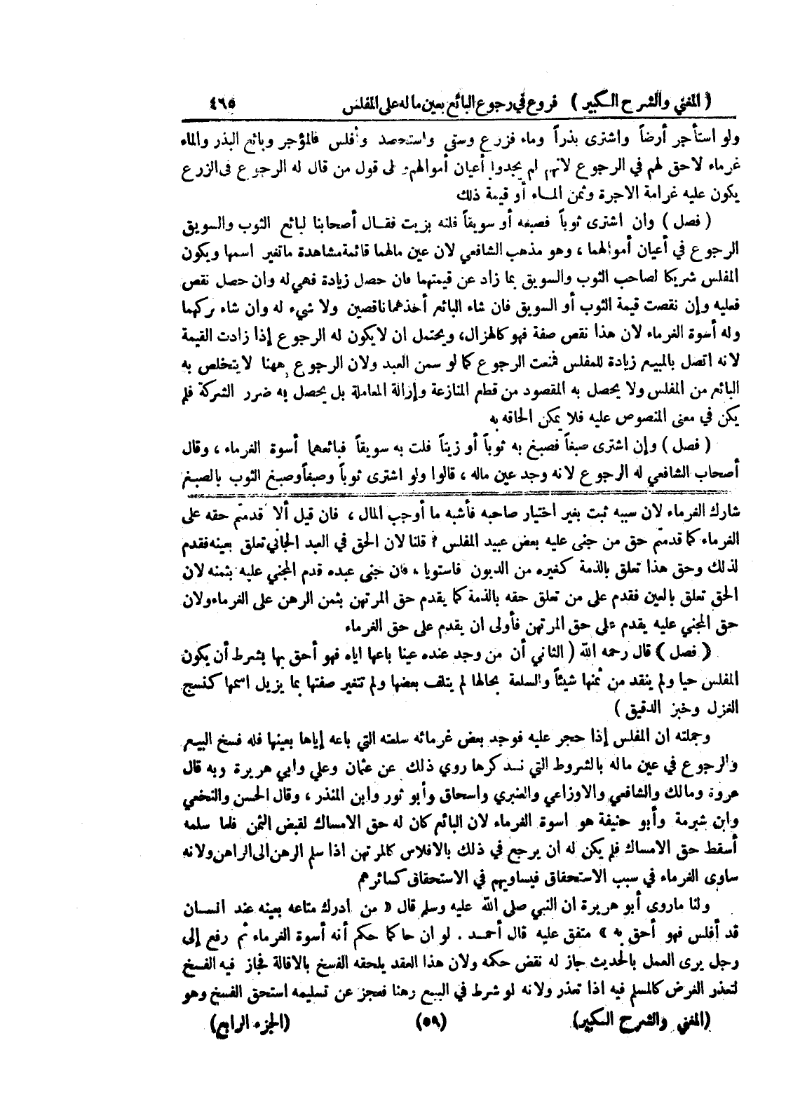 الحق تعلق بالعين فقدم على من تعلق حقه بالذمة كما يقدم حق المرتهن بثمن الرهن على الغرماء ولأن حق المجني عليه يقدم على حق المرتهن فأولى أن يقدم على حق الغرماء {فصل} قال رحمه الله (الثاني إن من وجد عنده عينا باعها إياه فهو أحق بها بشرط أن يكون المفلس حيا ولم ينقد من ثمنها شيئاً والسلعة بحالها لم يتلف بعضها ولم تتغير صفتها بما يزيل اسمها كنسج الغزل وخبز الدقيق) وجملته أن المفلس إذا حجر عليه فوجد بعض غرمائه سلعته التي باعه إياها بعينها فله فسخ البيع والرجوع في عين ماله بالشروط التي نذكرها روى ذلك عن عثمان وعلي وأبي هريرة وبه قال عروة ومالك والشافعي والاوزاعي والعنبري واسحاق وأبو ثور وابن المنذر، وقال الحسن والنخعي وابن شبرمة وأبو حنيفة هو اسوة الغرماء لأن البائع كان له حق الإمساك لقبض الثمن فلما سلمه أسقط حق الإمساك فلم يكن له أن يرجع في ذلك بالإفلاس كالمرتهن إذا سلم الرهن إلى الراهن ولأنه ساوى الغرماء في سبب الاستحقاق فيساويهم في الاستحقاق كسائرهم ولنا ما روى أبو هريرة أن النبي صلى الله عليه وسلم قال " من أدرك متاعه بعينه عند إنسان قد أفلس فهو أحق به " متفق عليه قال أحمد.