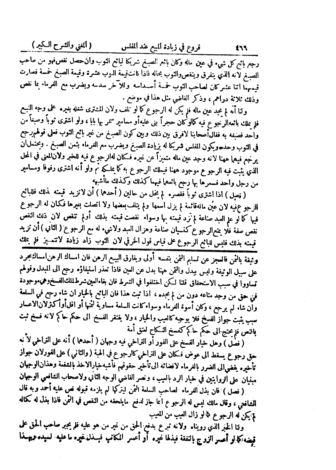 بالنص فلم يحتج إلى حكم حاكم كفسخ النكاح لعتق أمة (فصل) وهل خيار الفسخ على الفور أو التراخي فيه وجهان (أحدهما) أنه على التراخي لأنه حق رجوع يسقط إلى عوض فكان على التراخي كالرجوع في الهبة (والثاني) على الفور لان جواز تأخيره يفضي إلى الضرر بالغرماء لا فضائه إلى تأخير حقوقهم فأشبه خيار الأخذ بالشفعة وهذان الوجهان مبنيان على الروايتين في خيار الرد بالعيب، ونصر القاضي الوجه الثاني ولأصحاب الشافعي الوجهان (فصل) فإن بذل الغرماء لصاحب السلعة الثمن ليتركها لم يلزمه قبوله نص عليه أحمد وبه قال الشافعي، وقال مالك ليس له الرجوع إنما جاز لدفع ما يلحقه من النقص في الثمن فإذا بذل له بكماله لم يكن له الرجوع كما لو زال العيب من المعيب ولنا الخبر الذي رويناه ولأنه تبرع بدفع الحق من غير من هو عليه فلم يجبر صاحب الحق على قبضه كما لو أعسر الزوج النفقة فبذلها غيره أو أعسر المكاتب فبذل غيره ما عليه لسيده وبهذا