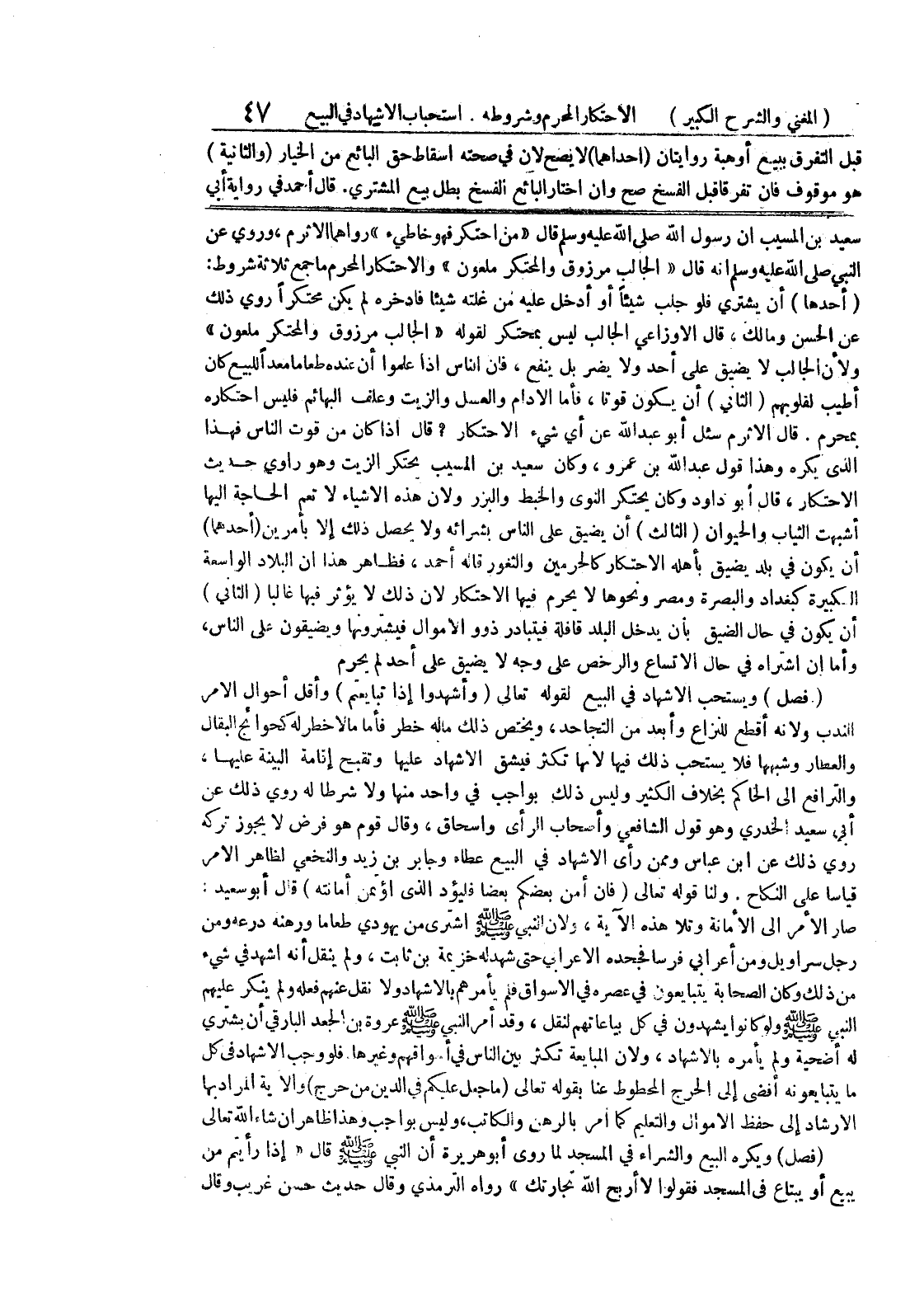 قال الأثرم سئل أبو عبد الله عن أي شئ الاحتكار؟ قال إذا كان من قوت الناس فهذا الذي يكره وهذا قول عبد الله بن عمرو، وكان سعيد بن المسيب يحتكر الزيت وهو راوي حديث الاحتكار، قال أبو داود وكان يحتكر النوى والخبط والبزر ولأن هذه الأشياء لاتعم الحاجة إليها أشبهت الثياب والحيوان (الثالث) أن يضيق على الناس بشرائه ولا يحصل ذلك إلا بأمرين (أحدهما) أن يكون في بلد يضيق بأهله الاحتكار كالحرمين والثغور قاله أحمد، فظاهر هذا أن البلاد الواسعة الكبيرة كبغداد والبصرة ومصر ونحوها لا يحرم فيها الاحتكار لأن ذلك لا يؤثر فيها غالباً (الثاني) أن يكون في حال الضيق بأن يدخل البلد قافلة فيتبادر ذوو الأموال فيشترونها ويضيقون على الناس، وأما ان اشتراه في حال الاتساع والرخص على وجه لا يضيق على أحد لم يحرم (فصل) ويستحب الإشهاد في البيع لقوله تعالى (وأشهدوا إذا تبايعتم) أقل أحوال الأمر الندب ولأنه أقطع للنزاع وأبعد من التجاحد، ويختص ذلك ماله خطر فأما مالا خطر له كحوائج البقال والعطار وشبهها فلا يستحب ذلك فيها لأنها تكثر فيشق الاشهاد عليها وتقبح إقامة البينة عليها، والترافع إلى الحاكم بخلاف الكثير وليس ذلك بواجب في واحد منها ولا شرطاً له روى ذلك عن أبي سعيد الخدري وهو قول الشافعي وأصحاب الرأى واسحاق، وقال قوم هو فرض لا يجوز تركه