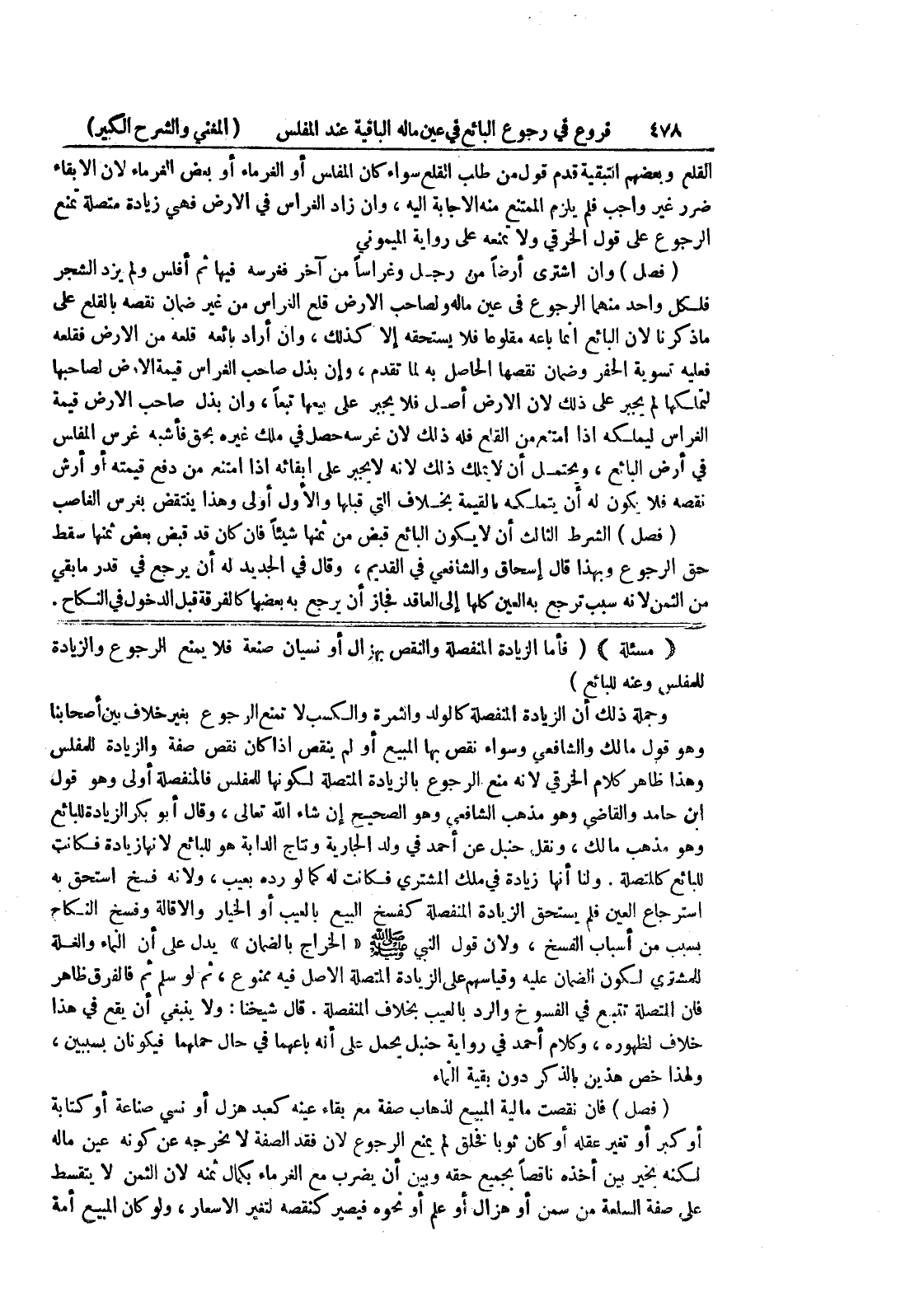 {مسألة} (فأما الزيادة المنفصلة والنقص بهزال أو نسيان صنعة فلا يمنع الرجوع والزيادة للمفلس وعنه للبائع) وجملة ذلك أن الزيادة المنفصلة كالولد والثمرة والكسب لا تمنع الرجوع بغير خلاف بين أصحابنا وهو قول مالك والشافعي وسواء نقص بها المبيع أو لم ينقص إذا كان نقص صفة والزيادة للمفلس وهذا ظاهر كلام الخرقي لانه منع الرجوع بالزيادة المتصلة لكونها للمفلس فالمنفصلة أولى وهو قول ابن حامد والقاضي وهو مذهب الشافعي وهو الصحيح إن شاء الله تعالى، وقال أبو بكر الزيادة للبائع وهو مذهب مالك، ونقل حنبل عن أحمد في ولد الجارية ونتاج الدابة هو للبائع لأنها زيادة فكانت للبائع كالمتصلة.