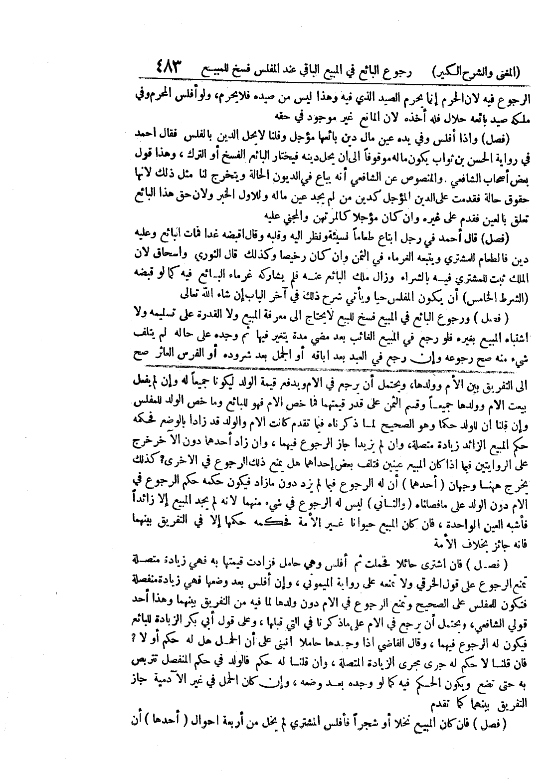 فإنه جائز بخلاف الأمة (فصل) فإن اشترى حائلا فحملت ثم أفلس وهي حامل فزادت قيمتها به فهي زيادة متصلة تمنع الرجوع على قول الخرقي ولا تمنعه على رواية الميموني، وإن أفلس بعد وضعها فهي زيادة منفصلة فتكون للمفلس على الصحيح وتمنع الرجوع في الأم دون ولدها لما فيه من التفريق بينهما وهذا أحد قولي الشافعي، ويحتمل أن يرجع في الأم على ما ذكرنا في التي قبلها، وعلى قول أبي بكر الزيادة للبائع فيكون له الرجوع فيهما، وقال القاضي إذا وجدها حاملا انبنى على أن الحمل هل له حكم أولا؟ فإن قلنا لا حكم له جرى مجرى الزيادة المتصلة، وإن قلنا له حكم فالولد في حكم المنفصل تتربص به حتى تضع ويكون الحكم فيه كما لو وجده بعد وضعه، وإن كان الحمل في غير الآدمية جاز التفريق بينهما كما تقدم (فصل) فإن كان المبيع نخلا أو شجراً فأفلس المشتري لم يخل من أربعة أحوال (أحدها) أن