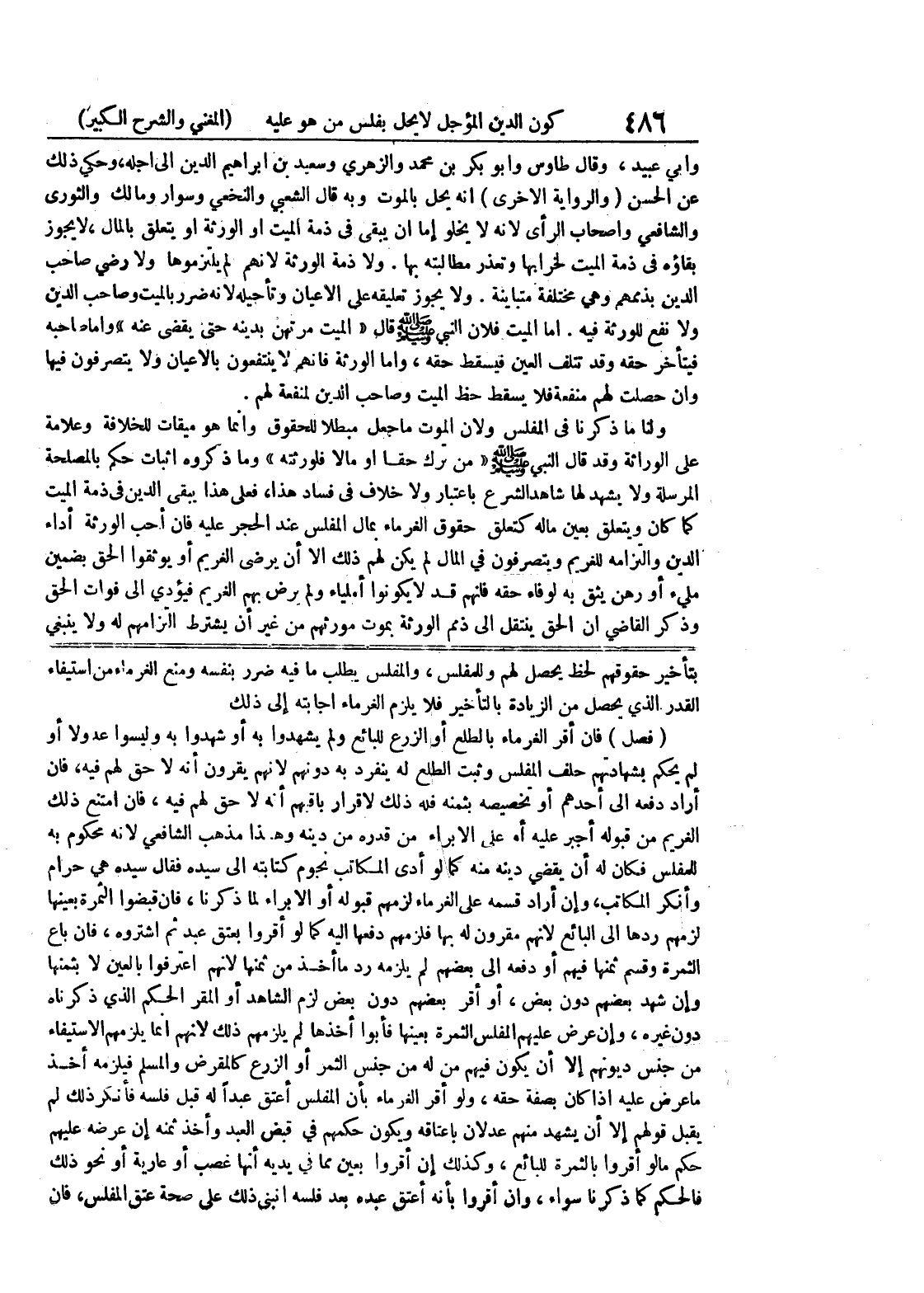 بتأخير حقوقهم لحظ يحصل لهم وللمفلس، والمفلس يطلب ما فيه ضرر بنفسه ومنع الغرماء من استيفاء القدر الذي يحصل من الزيادة بالتأخير فلا يلزم الغرماء أجابته إلى ذلك (فصل) فان أقر الغرماء بالطلع أو الزرع للبائع ولم يشهدوا به أو شهدوا به وليسوا عدولاً أو لم يحكم بشهادتهم حلف المفلس وثبت الطلع له ينفرد به دونهم لأنهم يقرون أنه لا حق لهم فيه، فإن أراد دفعة إلى أحدهم أو تخصيصه بثمنه فله ذلك لإقرار باقيهم أنه لا حق لهم فيه فإن امتنع ذلك الغريم من قبوله أجبر عليه أو على الإبراء من قدره من دينه وهذا مذهب الشافعي لأنه محكوم به للمفلس فكان له أن يقضي دينه منه كما لو أدى المكاتب نجوم كتابته إلى سيده فقال سيده هي حرام وأنكر المكاتب، ان أراد قسمة على الغرماء لزمهم قبوله أو الا براء لما ذكرنا، فإن قبضوا الثمرة بعينها لزمهم ردها إلى البائع لأنهم مقرون له بها فلزمهم دفعها إليه كما لو أقروا بعتق عبد ثم اشتروه، فإن باع الثمرة وقسم ثمنها فيهم أو دفعه إلى بعضهم لم يلزمه رد ما أخذ من ثمنها لأنهم اعترفوا بالعين لا بثمنها وإن شهد بعضهم دون بعض، أو أقر بعضهم دون بعض لزم الشاهد أو المقر الحكم الذي ذكرناه دون غيره، وإن عرض عليهم المفلس الثمرة بعينها فأبوا أخذها لم يلزمهم ذلك لأنهم إنما يلزمهم الاستيفاء من جنس ديونهم إلا أن يكون فيهم من له من جنس الثمر أو الزرع كالمقرض والمسلم فيلزمه أخذ ما عرض عليه إذا كان بصفة حقه، ولو أقر الغرماء، بأن المفلس أعتق عبداً له قبل فلسه فأنكر ذلك لم يقبل قولهم إلا أن يشهد منهم عدلان بإعتاقه ويكون حكمهم في قبض العبد وأخذ ثمنه إن عرضه عليهم حكم مالو أقروا بالثمرة للبائع، وكذلك إن أقروا بعين ما في يديه أنها غصب أو عارية أو نحو ذلك فالحكم كما ذكرنا سواء، وإن أقروا بأنه أعتق عبده بعد فلسه انبنى ذلك على صحة عتق المفلس، فإن