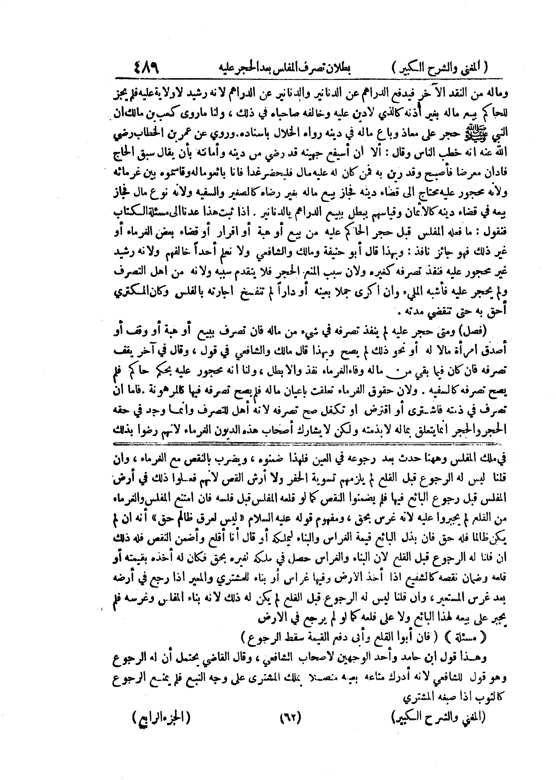 في ملك المفلس وههنا حدث بعد رجوعه في العين فلهذا ضمنوه، ويضرب بالنقص مع الغرماء، وإن قلنا ليس له الرجوع قبل القلع لم يلزمهم تسوية الحفر ولا أرش القص لأنهم فعلوا ذلك في أرض المفلس قبل رجوع البائع فيها فلم يضمنوا النقص كما لو قلعه المفلس قبل فلسه فإن امتنع المفلس والغرماء من القلع لم يجبروا عليه لأنه غرس بحق، ومفهوم قوله عليه السلام " ليس لعرق ظالم حق " أنه إن لم يكن ظالماً فله حق فإن بذل البائع قيمة الغراس والبناء ليملكه أو قال أنا أقلع وأضمن النقص فله ذلك إن قلنا له الرجوع قبل القلع لأن البناء والغراس حصل في ملكه لغيره بحق فكان له أخذه بقيمته أو قلعه وضمان نقصه كالشفيع إذا أخذ الأرض وفيها غراس أو بناء للمشتري والمعير إذا رجع في أرضه بعد غرس المستعير، وإن قلنا ليس له الرجوع قبل القلع لم يكن له ذلك لأنه بناء المفلس وغرسه فلم يجبر على بيعه لهذا البائع ولا على قلعه كما لو لم يرجع في الارض {مسألة} (فإن أبوا القلع وأبى دفع القيمة سقط الرجوع)