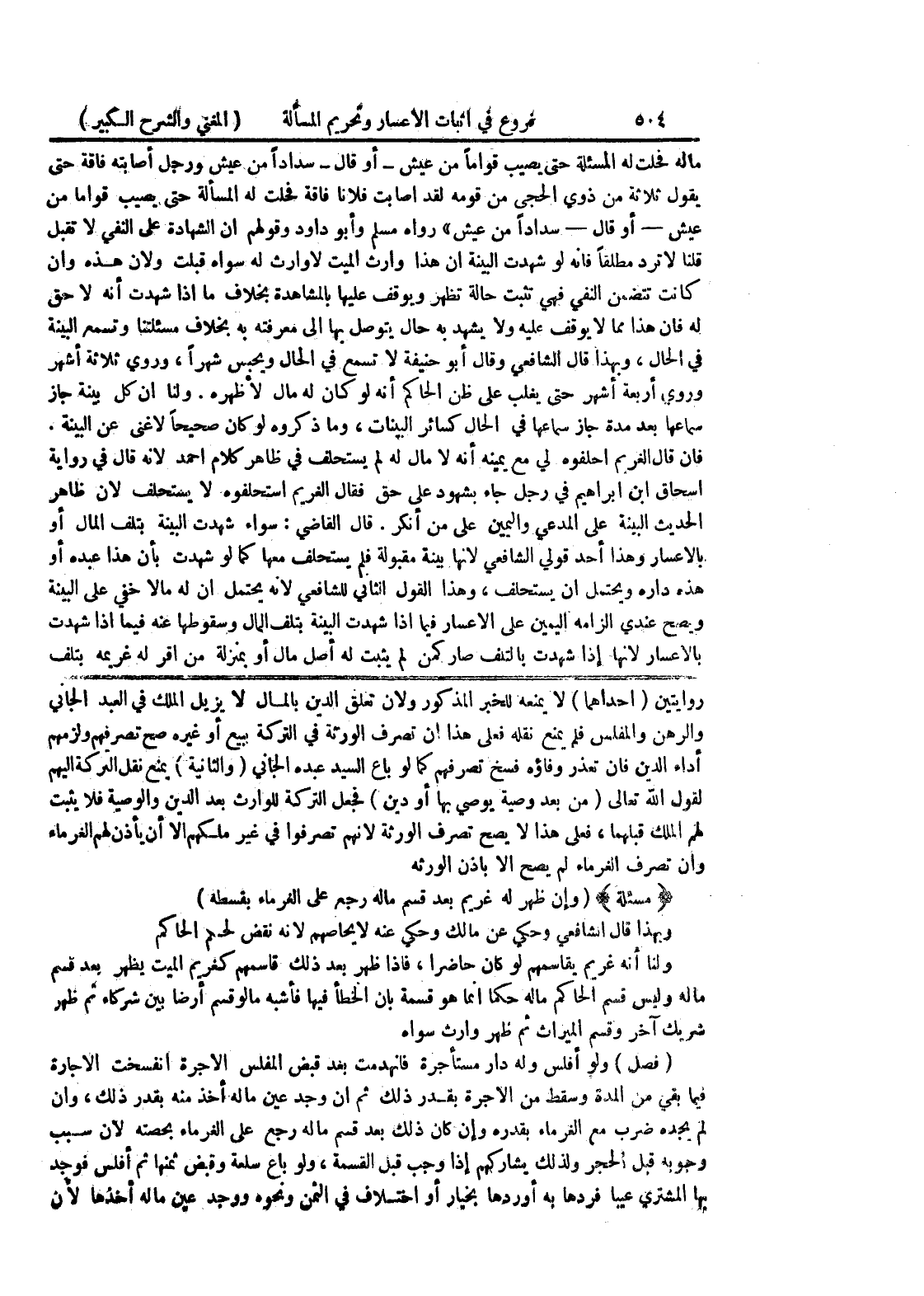 {مسألة} (وإن ظهر له غريم بعد قسم ماله رجع على الغرماء بقسطه) وبهذا قال الشافعي وحكي عن مالك وحكي عنه لا يحاصهم لأنه نقض لحكم الحاكم ولنا أنه غريم يقاسمهم لو كان حاضراً، فإذا ظهر بعد ذلك قاسمهم كغريم الميت يظهر بعد قسم ماله وليس قسم الحاكم ماله حكماً إنما هو قسمه بان الخطأ فيها فأشبه مالو قسم أرضاً بين شركاء ثم ظهر شريك آخر وقسم الميراث ثم ظهر وارث سواه (فصل) ولو أفلس وله دار مستأجرة فانهدمت بعد قبض المفلس الأجرة انفسخت الإجارة فيما بقي من المدة وسقط من الأجرة بقدر ذلك ثم إن وجد عين ماله أخذ منه بقدر ذلك، وإن لم يجده ضرب مع الغرماء بقدره وإن كان ذلك بعد قسم ماله رجع على الغرماء بحصته لأن سبب وجوبه قبل الحجر ولذلك يشاركهم إذا وجب قبل القسمة، ولو باع سلعة وقبض ثمنها ثم أفلس فوجد بها المشتري عيباً فردها به أو ردها بخيار أو اختلاف في الثمن ونحوه ووجد عين ماله أخذها لأن