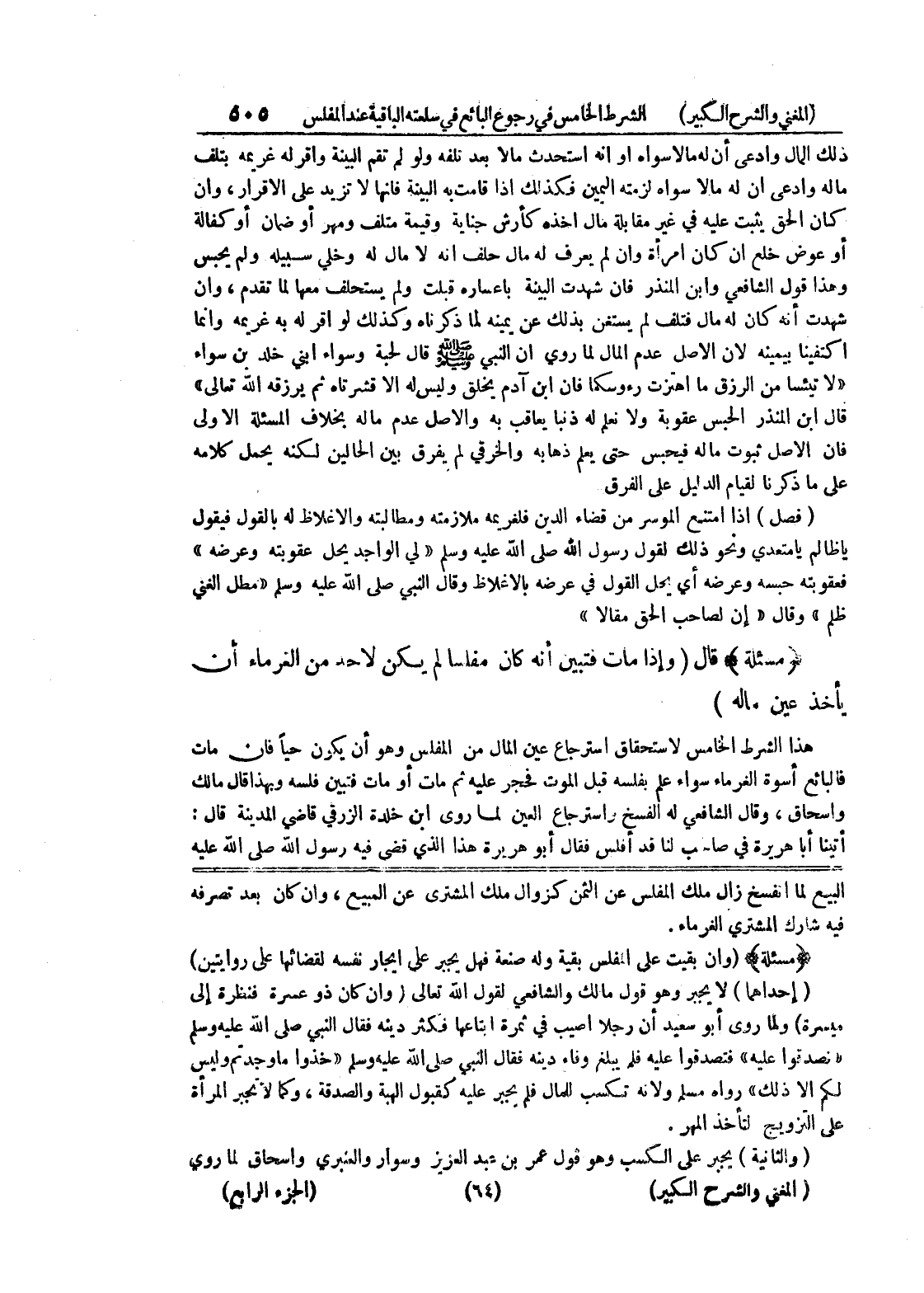 {مسألة} (وإن بقيت على المفلس بقية وله صنعة فهل يجبر على إيجار نفسه لقضائها على روايتين) (إحداهما) لا يجبر وهو قول مالك والشافعي لقول الله تعالى (وإن كان ذو عسرة فنظرة إلى ميسرة) ولما روى أبو سعيد أن رجلا أصيب في ثمرة ابتاعها فكثر دينه فقال النبي صلى الله عليه وسلم " تصدقوا عليه " فتصدقوا عليه فلم يبلغ وفاء دينه فقال النبي صلى الله عليه وسلم " خذوا ما وجدتم وليس لكم إلا ذلك " رواه مسلم ولأنه تكسب للمال فلم يجبر عليه كقبول الهبة والصدقة، وكما لا تجبر المرأة على التزويج لتأخذ المهر.