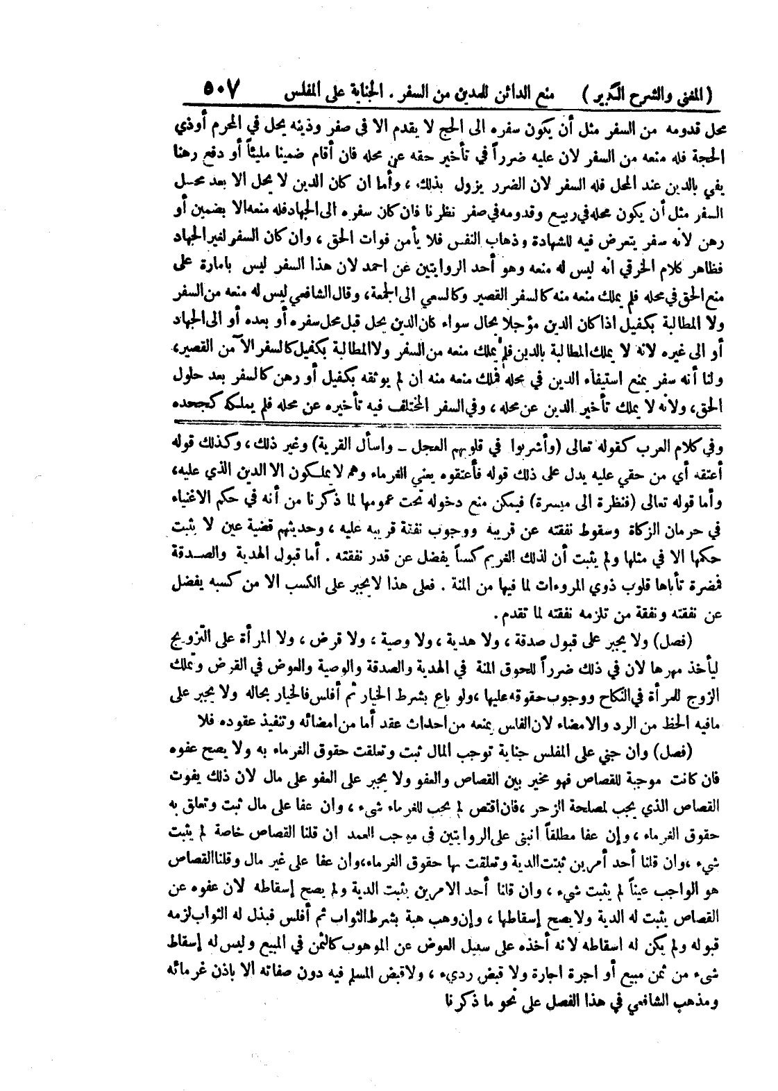 (فصل) ولا يجبر على قبول صدقة، ولا هدية، ولا وصية، ولا قرض، ولا المرأة على التزويج ليأخذ مهرها لأن في ذلك ضرراً للحوق المنة في الهدية والصدقة والوصية والعوض في القرض وتملك الزوج للمرأة في النكاح وجوب حقوقه عليها، ولو باع بشرط الخيار ثم أفلس فالخيار بحاله ولا يجبر على ما فيه الحظ من الرد والإمضاء لأن الفلس يمنعه من إحداث عقد أما من امضائه وتنفيذ عقود فلا (فصل) وإن جنى على المفلس جناية توجب المال ثبت وتعلقت حقوق الغرماء به ولا يصح عفوه فإن كانت موجبة للقصاص فهو مخير بين القصاص والعفو ولا يجبر على العفو على مال لأن ذلك يفوت