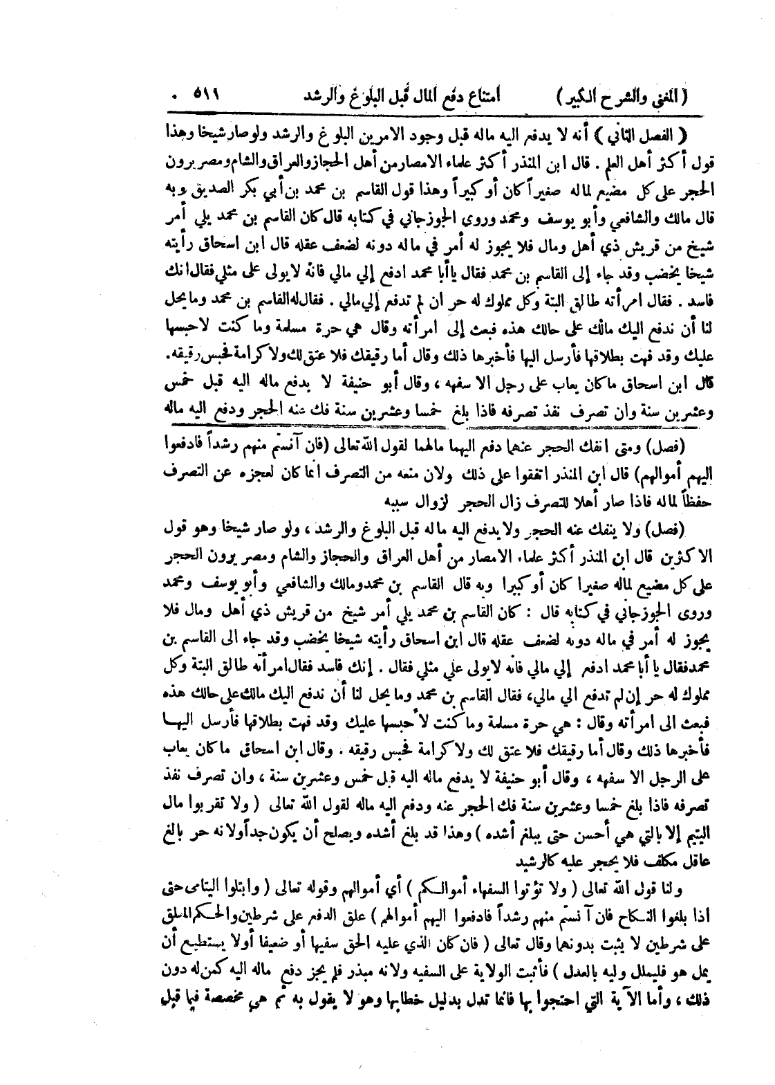 (فصل) ومتى انفك الحجر عنهما دفع إليهما مالهما لقول الله تعالى (فإن آنستم منهم رشدا فادفعوا إليهم أموالهم) فقال ابن المنذر اتفقوا على ذلك ولأن منعه من التصرف إنما كان لعجزه عن التصرف حفظاً لماله فإذا صار أهلاً للتصرف زال الحجر لزوال سببه (فصل) ولا ينفك عنه الحجر ولا يدفع إليه ماله قبل البلوغ والرشد، ولو صار شيخاً وهو قول الأكثرين قال إبن المنذر أكثر علماء الأمصار من أهل العراق والحجاز والشام ومصر يرون الحجر على كل مضيع لماله صغيرا كان أو كبيراً وبه قال القاسم بن محمد ومالك والشافعي وأبو يوسف ومحمد وروى الجوزجاني في كتابه قال: كان القاسم بن محمد يلي أمر شيخ من قريش ذي أهل ومال فلا يجوز له أمر في ماله دونه لضعف عقله قال ابن إسحاق رأيته شيخاً يخضب وقد جاء إلى القاسم بن محمد فقال يا أبا محمد ادفع إلي مالي فإنه لا يولي على مثلي فقال.