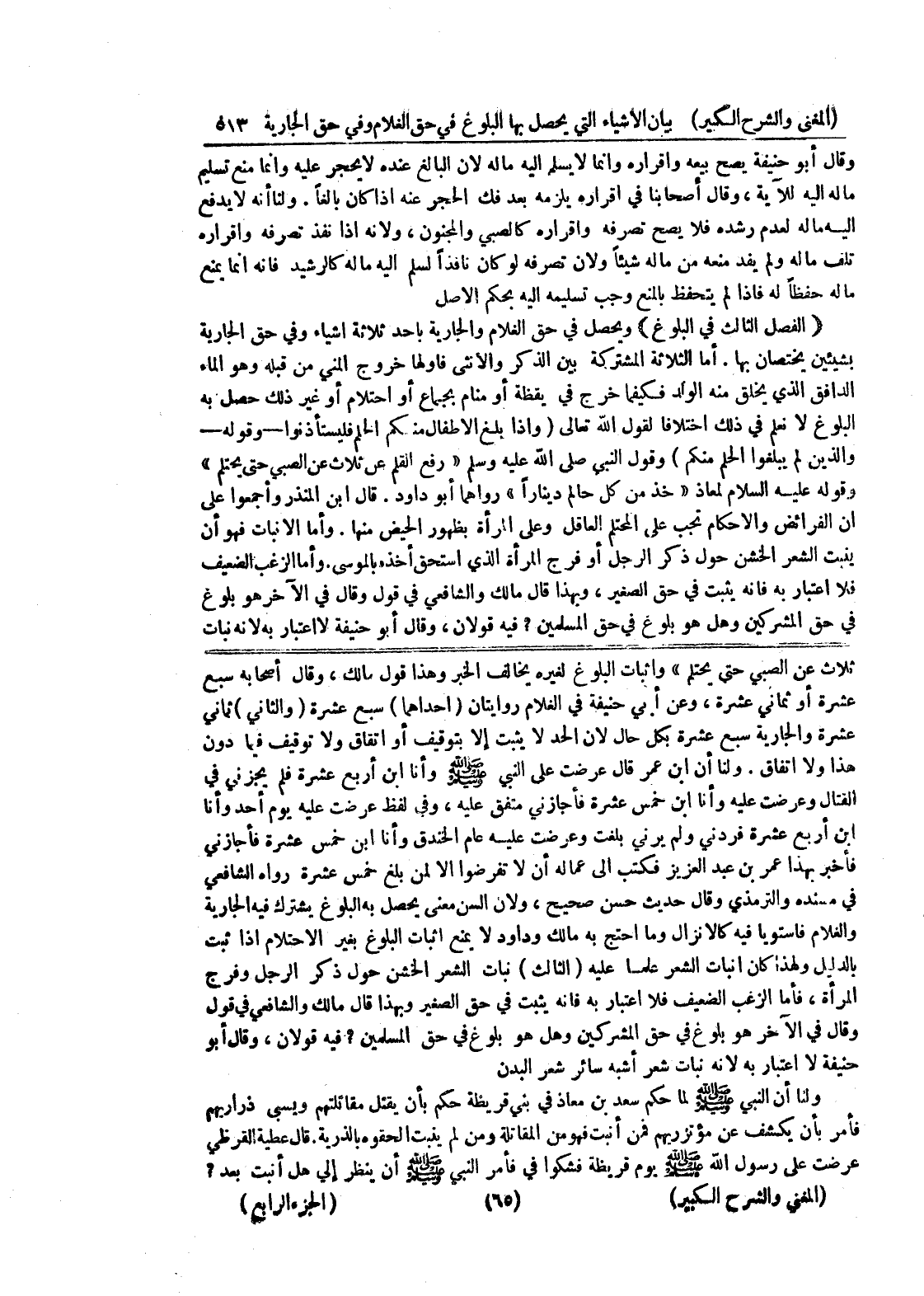 ولنا أن ابن عمر قال عرضت على النبي صلى الله عليه وسلم وأنا ابن أربع عشرة فلم يجزني في القتال وعرضت عليه وأنا ابن خمس عشرة فأجازني متفق عليه، وفي لفظ عرضت عليه يوم أحد وأنا ابن أربع عشرة فردني ولم يرني بلغت وعرضت عليه عام الخندق وأنا ابن خمس عشرة فأجازني فأخبر بهذا عمر بن عبد العزيز فكتب إلى عماله أن لا تفرضوا إلا لمن بلغ خمس عشرة رواه الشافعي في مسنده والترمذي وقال حديث حسن صحيح، ولأن السن معنى يحصل به البلوغ يشترك فيه الجارية والغلام فاستويا فيه كالإنزال وما احتج به مالك وداود لايمنع اثبات البلوغ بغير الاحتلام إذا ثبت بالدليل ولهذا كان انبات الشعر علماً عليه (الثالث) نبات الشعر الخشن حول ذكر الرجل وفرج المرأة، فأما الزغب الضعيف فلا اعتبار به فإنه يثبت في حق الصغير وبهذا قال مالك والشافعي في قول وقال في الآخر هو بلوغ في حق المشركين وهل هو بلوغ في حق المسلمين؟ فيه قولان، وقال أبو حنيفة لااعتبار به لأنه نبات شعر أشبه سائر شعر البدن