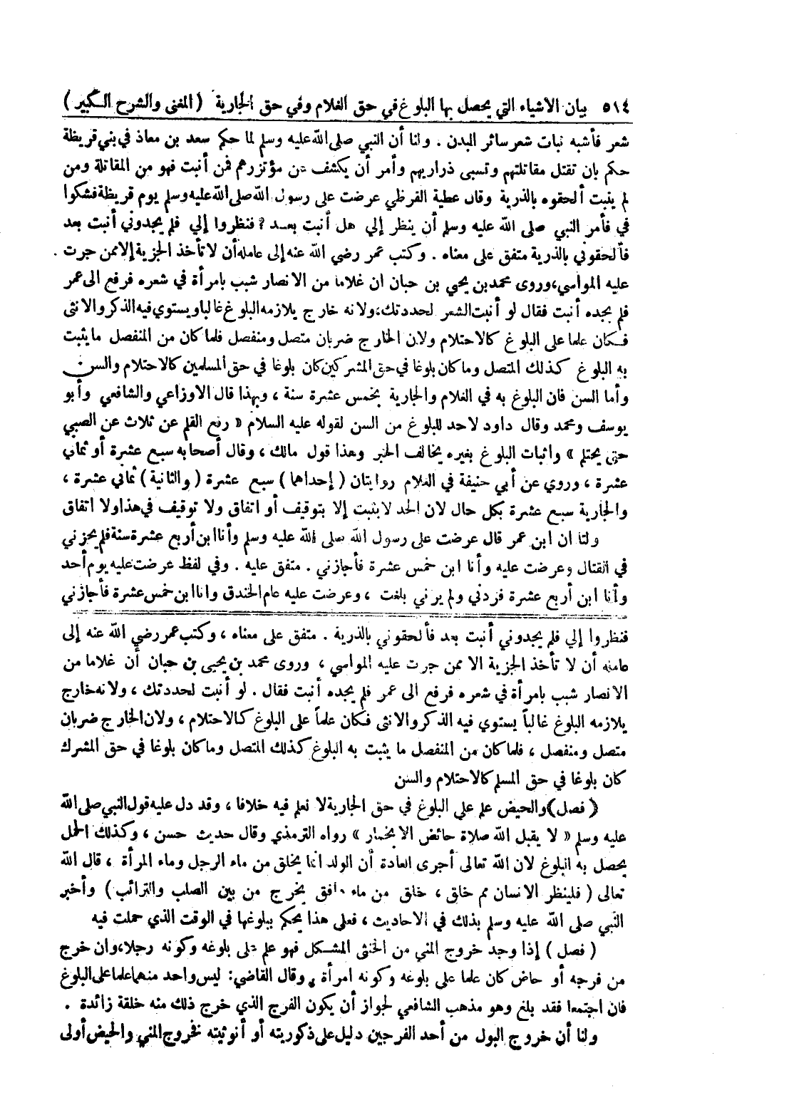 لو أنبت لحددتك، ولأنه خارج يلازمه البلوغ غالبا يستوي فيه الذكر والأنثى فكان علما على البلوغ كالاحتلام، ولأن الخارج ضربان متصل ومنفصل، فلما كان من المنفصل ما يثبت به البلوغ كذلك المتصل وما كان بلوغاً في حق المشرك كان بلوغاً في حق المسلم كالاحتلام والسن {فصل} والحيض علم على البلوغ في حق الجارية لا نعلم فيه خلافاً، وقد دل ذلك عليه قول النبي صلى الله عليه وسلم " لا يقبل الله صلاة حائض إلا بخمار " رواه الترمذي وقال حديث حسن، وكذلك الحمل يحصل به البلوغ لأن الله تعالى أجرى العادة أن الولد إنما يخلق من ماء الرجل وماء المرأة، قال الله تعالى (فلينظر الإنسان مم خلق، خلق من ماء دافق يخرج من بين الصلب والترائب) وأخبر النبي صلى الله عليه وسلم بذلك في الأحاديث، فعلى هذا يحكم ببلوغها في الوقت الذي حملت فيه (فصل) إذا وجد خروج المني من الخنثى المشكل فهو علم على بلوغه وكونه رجلا، وإن خرج من فرجه أو حاض كان علما على بلوغه وكونه امرأة.