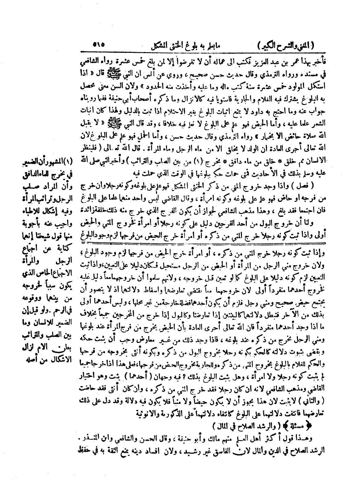 التعيين لزم كونه دليلاً على البلوغ كما لو تعين قبل خروجه، ولأنهم سلموا أن خروجهما معاً دليل عليه فخروج أحدهما منفرداً أولى لأن خروجهما معاً يقتضي تعارضهما وإسقاط دلالتهما إذ لا يتصور أن يجتمع حيض صحيح ومني رجل فلزم أن يكون أحدهما فضلة خارجه من غير محلها، وليس أحدهما أولى بذلك من الآخر فتبطل دلالتهما كالبينتين إذا تعارضتا وكالبول إذا خرج من المخرجين جميعاً بخلاف ما إذا وجد أحدهما منفرداً فإن الله تعالى أجرى العادة بأن الحيض يخرج من فرج المرأة عند بلوغها ومني الرجل يخرج من ذكره عند بلوغه، فإذا وجد ذلك من غير معارض وجب أن يثبت حكمه ويقضي بثبوت دلالته كالحكم بكونه رجلا بخروج البول من ذكره وبكونه أنثى بخروجه من فرجها والحكم للغلام بالبلوغ بخروج المني من ذكره وللجارية بخروج الحيض من فرجها، فعلى هذا إذا خرجا جميعاً لم يثبت كونه رجلا ولا امرأة، وهل يثبت البلوغ بذلك؟ فيه وجهان (أحدهما) يثبت وهو اختيار القاضي ومذهب الشافعي لأنه إن كان رجلا فقد خرج المني من ذكره، وإن كان أنثى فقد حاضت (والثاني) لا يثبت لأن هذا يجوز أن لا يكون حيضاً ولا منياً فلا يكون فيه دلالة وقد دل على ذلك تعارضهما فانتفت دلالتهما على البلوغ كانتفاء دلالتهما على الذكورية والأنوثية {مسألة} (والرشد الصلاح في المال) وهذا قول أكثر أهل العلم منهم مالك وأبو حنيفة، وقال الحسن والشافعي وابن المنذر.