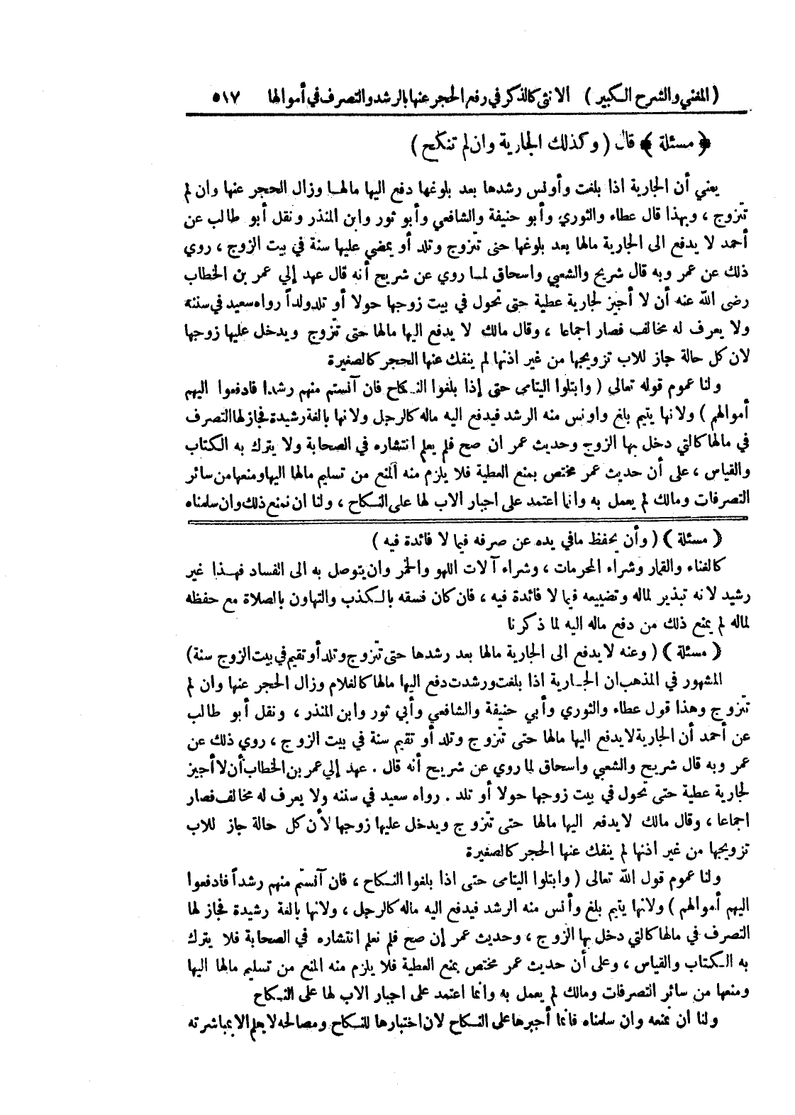 {مسألة} (وأن يحفظ ما في يده عن صرفه فيما لا فائدة فيه) كالغناء والقمار وشراء المحرمات، وشراء آلات اللهو والخمر وأن يتوصل به إلى الفساد فهذا غير رشيد لأنه تبذير لماله وتضييعه فيما لا فائدة فيه، فإن كان فسقه بالكذب والتهاون بالصلاة مع حفظه لماله لم يمنع ذلك من دفع ماله إليه لما ذكرنا {مسألة} (وعنه لا يدفع إلى الجارية مالها بعد رشدها حتى تتزوج وتلد أو تقيم في بيت الزوج سنة) المشهور في المذهب أن الجارية إذا بلغت ورشدت دفع إليها مالها كالغلام وزال الحجر عنها وإن لم تتزوج وهذا قول عطاء والثوري وأبي حنيفة والشافعي وأبي ثور وابن المنذر، ونقل أبو طالب عن أحمد أن الجارية لا يدفع إليها مالها حتى تتزوج وتلد أو تقيم سنة في بيت الزوج، روى ذلك عن عمر وبه قال شريح والشبعي واسحاق لما روي عن شريح أنه قال.
