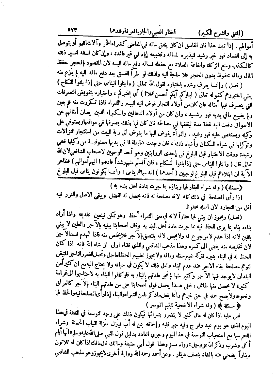 باللبن لأنه إذا هدم لا مرجوع له ولا بجص لأنه يلتصق بالآجر فلا يخلص منه فإذا انهدم فسد الآجر لأن تخليصه منه يفضي إلى كسره وهذا مذهب الشافعي والذي قلناه أولى إن شاء الله فإنه إذا كان الحظ له في البناء بغيره فتركه ضيع حظه وماله ولايجوز تضييع الحظ العاجل وتحمل الضرر الناجز المتيقن لتوهم مصلحة بقاء الآجر عند هدم البناء ولعل ذلك لا يكون في حياته ولا يحتاج إليه مع أن كثيراً من البلدان لا يوجد فيها الآجر وكثير منها لم تجر عادتهم بالبناء به فلو كلفوا البناء به لاحتاجوا إلى غرامه كثيرة لا يحصل منها طائل، فعلى هذا يحمل قول أصحابنا على من عادتهم البناء بالآجر كالعراق ونحوها ولا يصح حمله في حق غيرهم وإنما يفعل ما ذكرنا من الشراء والبناء إذا رأى المصلحة فيه والحظ لهما {مسألة} (وله شراء الأضحية لليتيم الموسر) نص عليه إذا كان له مال كثير لا يتضرر بشرائها فيكون ذلك على وجه التوسعة في النفقة في هذا اليوم الذي هو يوم عيد وفرج وفيه جبر قلبه وإلحاقه بمن له أب فينزل منزلة الثياب الحسنة وشراء اللحم سيما مع استحباب التوسعة في هذا اليوم وجري العادة بدليل قول النبي صلى الله عليه وسلم " أنها أيام أكل وشرب وذكر الله عزوجل " رواه مسلم وهذا قول أبي حنيفة ومالك قال مالك إذا كان له ثلاثون ديناراً يضحي عنه بالشاة بنصف دينار.