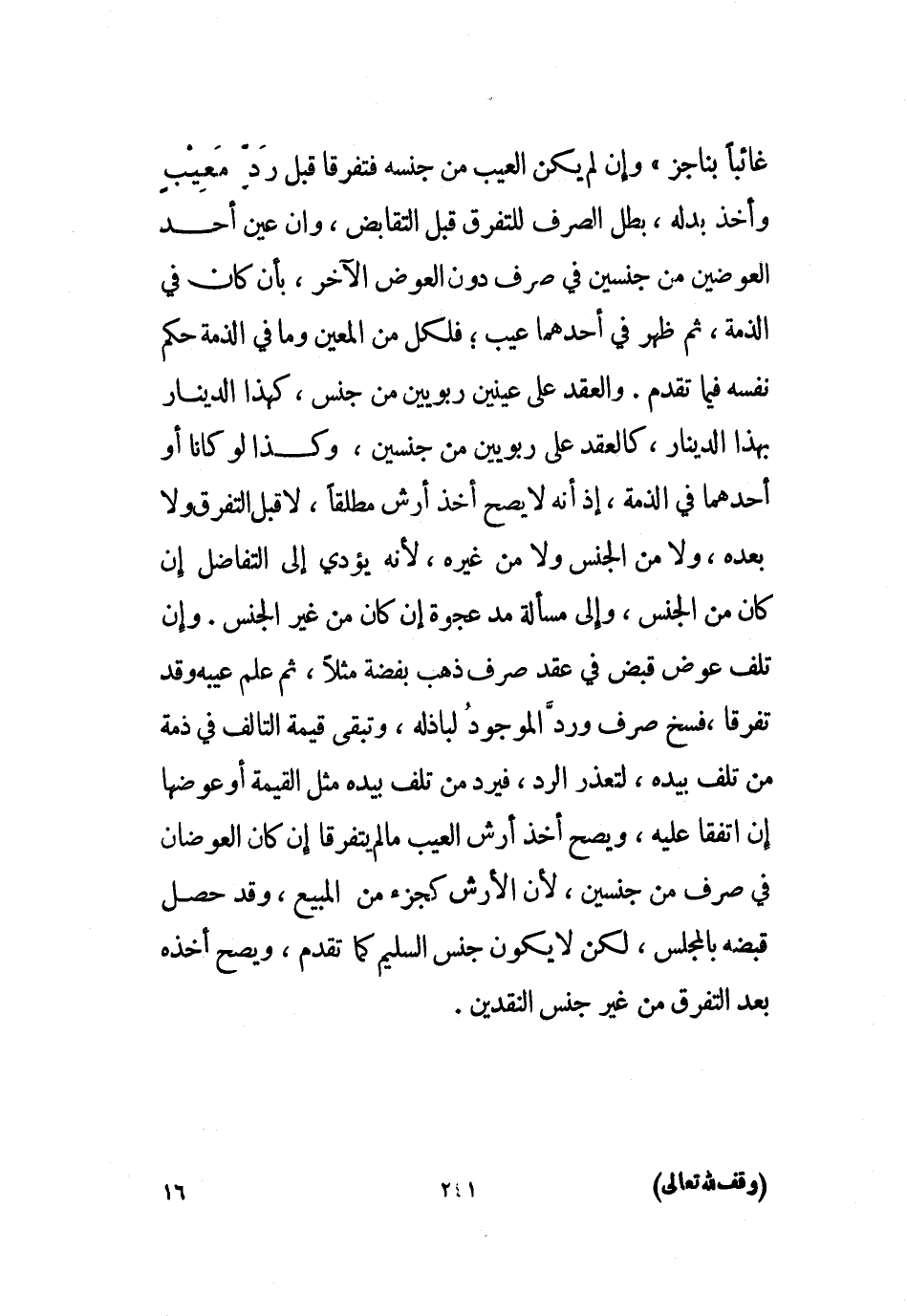 مَيَّزَ بينهما. رواه أبو داود. قال في «شرح الإقناع» :وللأصحاب في توجيه البطلان مأخذان، أحدهما: وهو مأخذ القاضي وأصحابه: أن الصفقة إذا جمعت شيئين مختلفي القيمة انقسم الثمن على قدر ملكيهما، كما لو اشترى شقصًا وسيفًا؛ فإن الشفيع يأخذ الشقص بقسطه منه، وهذا يؤدي إلى العلم بالتفاضل أو إلى الجهل بالتساوي، وكلاهما يبطل العقد، فإنه إذا باع درهمًا ومدًا يساوي درهمين بمدين يساويان ثلاثة دراهم، كان الدرهم في مقابلة ثلثي مُدّ، ويبقى مد في مقابلة مُدّ وثلث، وذلك ربًا. فلو فرض التساوي كمد يساوي درهمًا ودرهم بمد يساوي درهمًا، ودرهم لم يُجز؛ لأن التقويم ظن وتخمين، فلا تتحقق معه المساواة، والجهل بالتساوي كالعلم بالتفاضل، وضعف هذه الطريقة ابن رجب قال: لأن التقسيم هو قسمة الثمن على قيمة المثمن، لا أجزاء أحدهم على قيمة الآخر، والمأخذ الثاني: سد ذريعة الربا، لئلا يتخذ ذلك حيلة على الربا الصريح، كبيع مائة درهم في كيس بمائتين، جعلاً للمائة في مقابلة الكيس، وقد لا يساوي درهمًا. وفي كلام الإمام إيماء هذا المأخذ. اهـ.