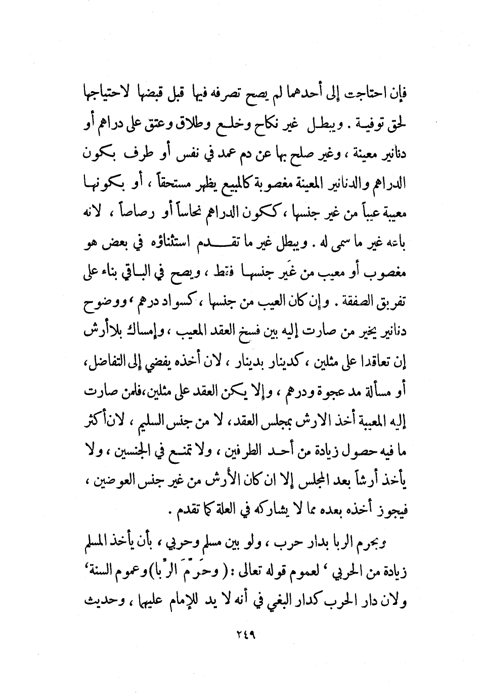 يحرب ربا النسيئة بين ما اتفقا علة ربا الفضل، كبيع مدَّ بُرٍّ بمدَّ بُرٍ، أو بشعير، وكبيع درهم من قز برطل من خبز، فيشترط لذلك حلول وقبض بالمجلس سواء اتحد الجنس أو اختلف، وتماثل إن اتحد الجنس؛ ولأنهما مالان من أموال الربا علتهما متفقة، فيحرم التفرق فيهما قبل القبض كالصرف، ولا يعتبر ذلك إن كان أحد العوضين نقدًا إلا في صرف النقد بفلوس نافقة، فيشترط الحلو والقبض إلحاقًا لها بالنقد، وقال في «الإقناع وشرحه» : ولو في فلوس نافقة بنقد، فيجوز النساء، واختاره الشيخ تقي الدين وغيره كابن عقيل، وذكره الشيخ رواية، قال في «الرعاية» : إن قلنا: هي عرض جاز، وإلا فلا. اهـ. والذي تميل إليه النفس ما مشى عليه في «الإقناع» حيث جوز النساء في صرف الفلوس بالنقد. والله أعلم.