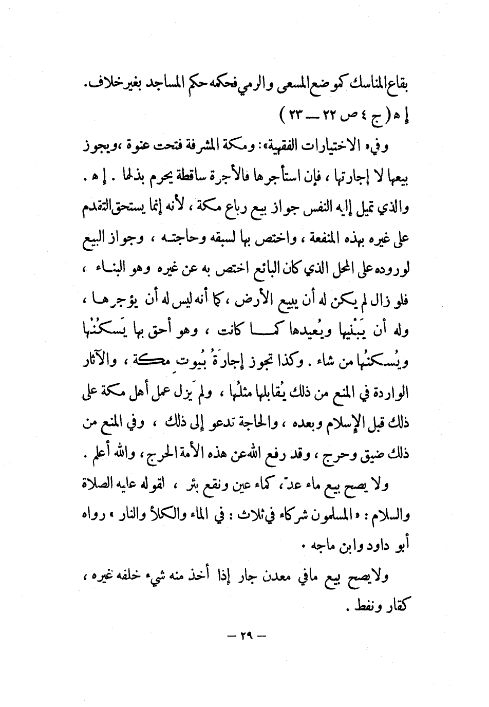 واشترى عمر - رضي الله عنه - دار السجن من صفوان بن أمية بأربعة آلاف، ولم يزل أهل مكة يتصرفون في درهم تصرف الملاك بالبيع وغيره، ولم ينكره منكر، فكان إجماعًا، وقد قرره النبي - صلى الله عليه وسلم -، بنسبة دورهم