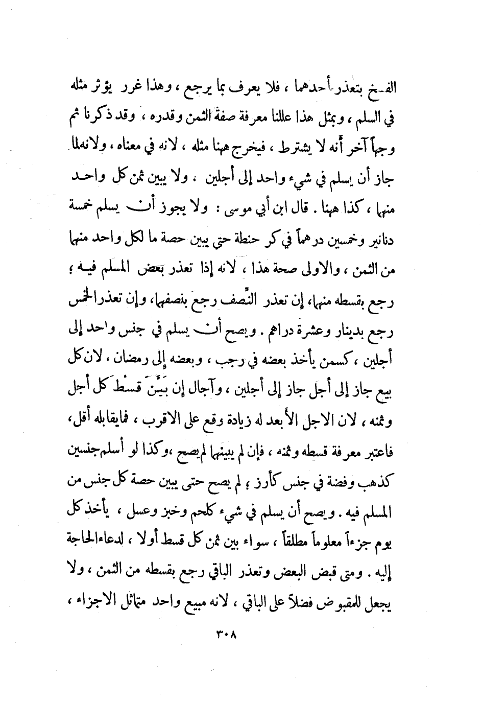 ويصح فيما يجمع أخلاطًا متميزة كثوب نسج من نوعين كقطن وكتان أو إبريسم وقطن، وكنشاب ونيل مريشين، وخفاف، ورماح متوزة، أي مصنوعة ونحوها، لإمكان ضبطها بصفة لا يختلف ثمنها معها غالبًا، يصح السلم في عين من عقار وشجر نابت وغيرهما؛ لأن المعين يمكن بيعه في الحال، فلا حاجة