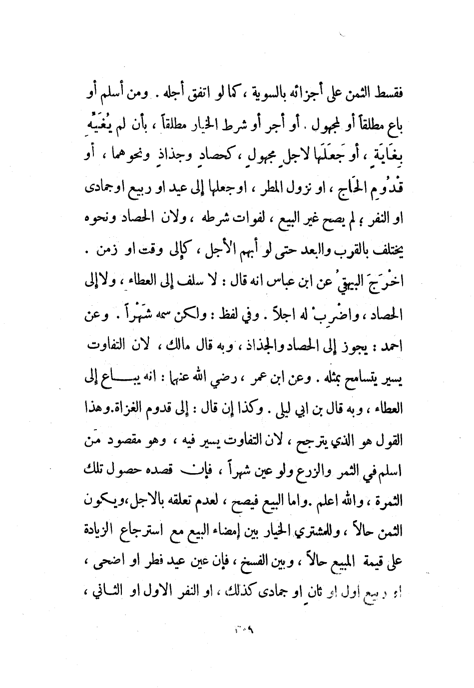 ويصح السلم في أثمان خالصة؛ لأنها تثبت في الذمة ثمنًا، فتثبت سلمًا كعروض، ويكون رأس المال غير الأثمان كثوب وفرس، لئلا يفضي إلى ربا النسيئة، ويصح في فلوس ولو نافقة وزنًا وعددًا على الصحيح من المذهب، ويكون رأس مال الفلوس عرضًا. ويصح في عرض بعرض، كتمر في فرس، وحمار في حمار، ولا يصح السلم