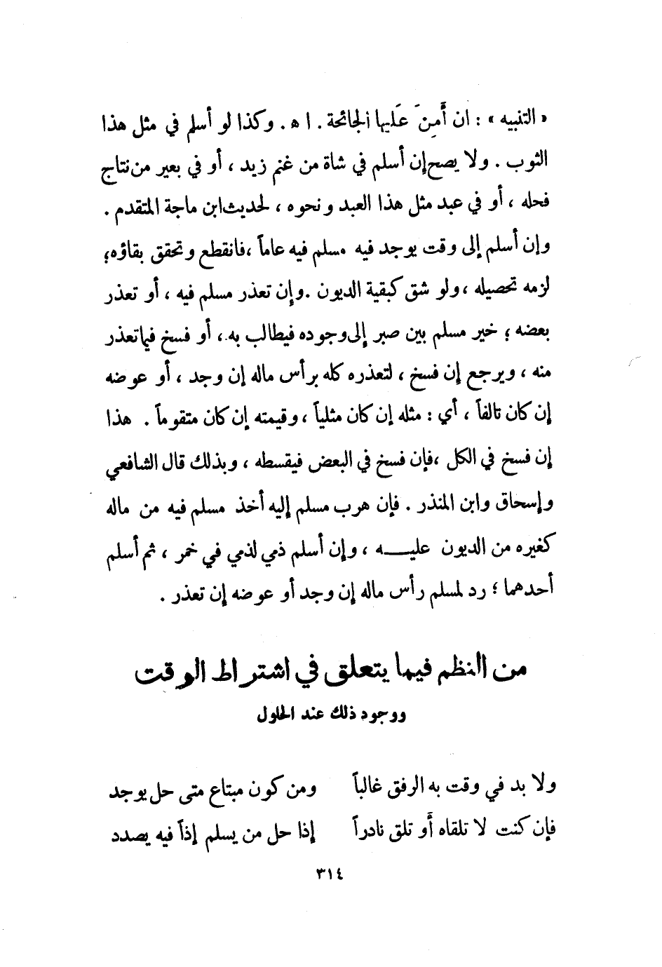 قال القاضي: ويذكر المرعى، ولا يحتاج لذكر عتيق أو حديث؛ لأن الإطلاق يقتضي الحديث. ولا يصح السلم في عتيق السمن؛ لأنه عيب، ولا ينتهي إلا حد يضبط به، ويصفُ الزبد بأوصاف السمن، ويزيد على وصف السمن: زبد يومه، أو زبد أمسه، ولا يلزم المسلم قبول متغير من سمن وزبد ولا قبول سمن أو زبد رقيق، إلا أن تكون رقتهما من الحر، ويَصِفُ اللبن بنوع ومرعى، ولا يحتاج للون لعدم اختلاف، ولا إلى كونه حليب يوم؛ لأن الإطلاق يقتضي ذلك؛ فإن ذكر كان مؤكدًا، ولا يلزم قبول لبن متغير بنحو حموضة؛ لأن الإطلاق يقتضي السلامة. ويصح السلم في المخيض؛ لأن ما فيه من الماء يسير لمصلحته، وجرت العادة به، فهو كالملح في الجبن, ويَصفُ الجبن بنوع ومرعى، ورطب أو يابس، جيد أو رديء. ويَصِفُ اللبأ كما يصف اللبن بالنوع والمرعى، ويزيد ذكر اللون والطبخ أو عدمه، ويسلم في اللبأ وزنًا؛ لأنه يجمد عقب حلبه، فلا يتحقق فيه الكيل.