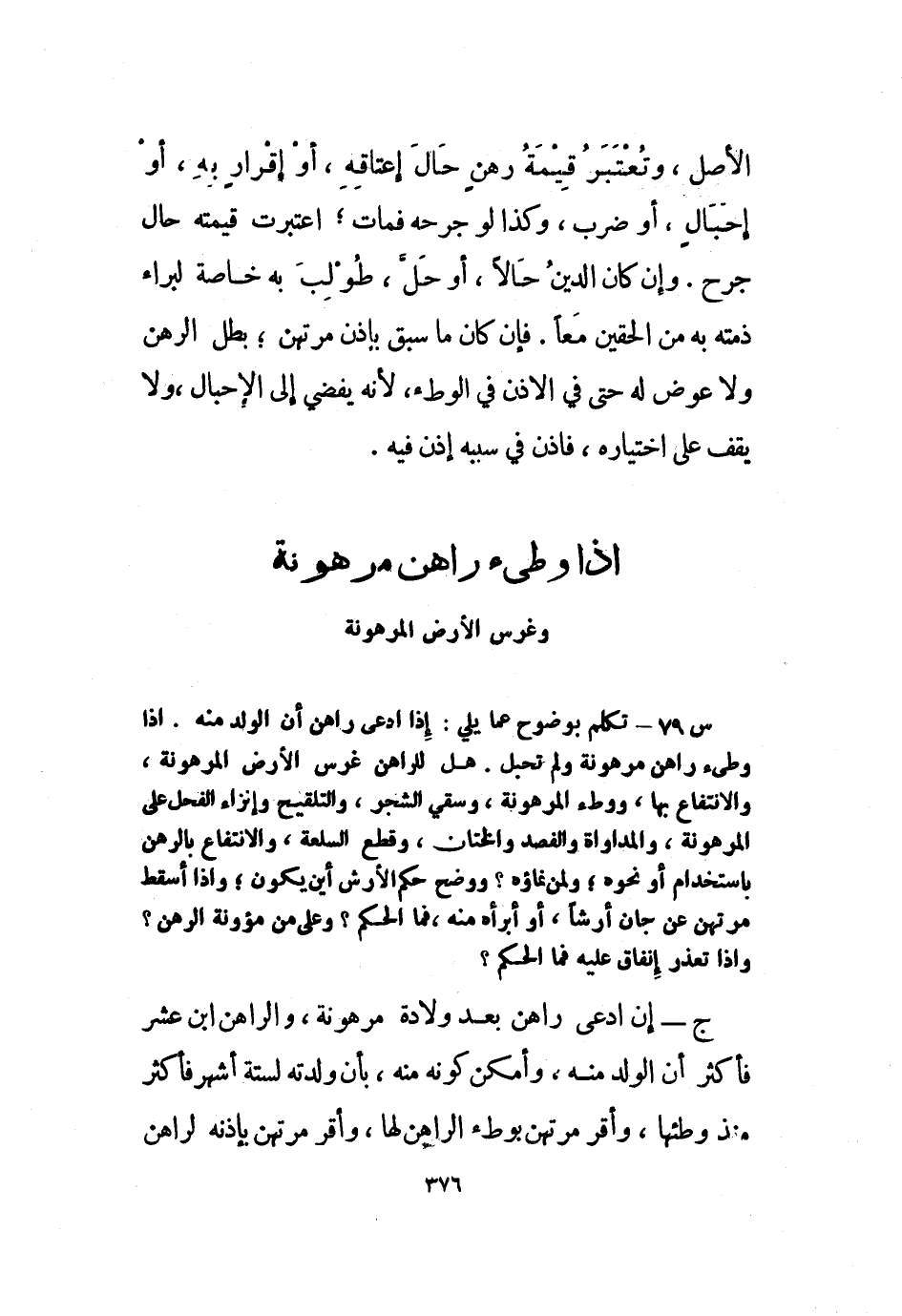 س74: ما حكم ضمان العارية إذا رهنت، والمبيع قبل قبضه، والمشاع؟ وإذا لم يرض شريك ومرتهن بكون المشترك بيد أحدهما أو بيد غيرهما، أو كان الرهن مكاتبًا أو مصحفًا، أو كتب حديث أو تفسير، أو جانبًا أو مدبرًا، أو معلقًا عتقه بصفة، أو كان مما يسرع إليه الفساد، أو قنًا مسلمًا لكافر، فما الحكم؟ واذكر ما يتفرع على ذلك