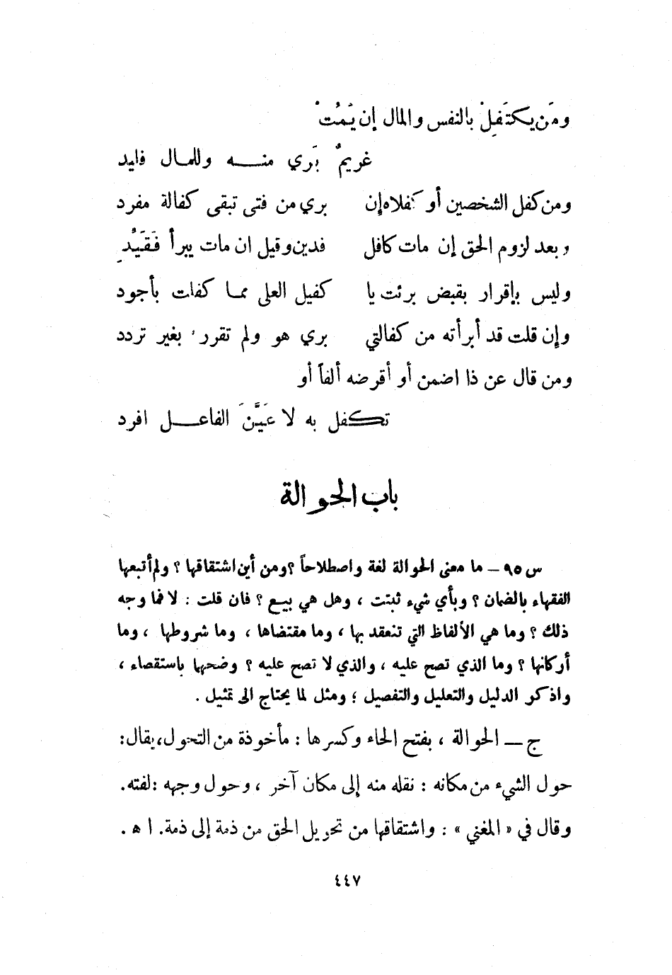 البدل والعوض، ولا ضمان على آخذه إن أخذه ليريه أهله بلا مساومة ولا قطع ثمن؛ لأنه لا سوم فيه، فلا يصح ضمانه. ومعنى ضمان غصب ونحوه ضمان استنقاذه، والتزام تحصيله أو قيمته عند تلفه، فهو كعهدة المبيع، ولا ضمان بعض لم يقدر من دين لجهالته حالاً ومآلاً، وكذا لو ضمن أحد دينيه.