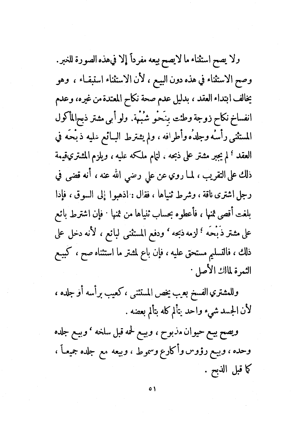 ويصح استثناء جريب من أرض، وذراعٍ من ثوبٍ، إذا كان المستثنى مُعينًا بابتداء وانتهاء معًا؛ لأنها ثنيا معلومة؛ فإن عين أحدهما دون الآخر لم يصح. وفي كتاب «المهذب» : وإن قال بعتك عشرة أذرع ابتداؤها من هذا المكان، ولم يبين المنتهى، ففيه وجهان: أحدهما: لا يصح؛ لأن أجزاء الأرض مختلفة، وقد ينتهي إلى موضع يخالف موضع الابتداء، والثاني: أنه يصح؛ لأنه يشاهد السمت. اهـ. قلت: والوجه الثاني عندي أنه قوي، وإن قال: بعتك من هذا الثوب من هذا الموضع، صح البيع للعلم بالمبيع؛ فإن كان القطع لا ينقصه قطعاه، أو كان شَرَطَه البائعُ للمشتري قطعاه، ولو نقَّصَهُ إذًا وفاءَ بالشرط. وإن كان القطع ينقص الثوب ولم يشترطاه، وتشاحا في القطع، صح البيع، ولم يجبر البائع على قطع الثوب، وكانا شريكين فيه؛ لأن الضرر لا يزال بالضرر؛ فإن